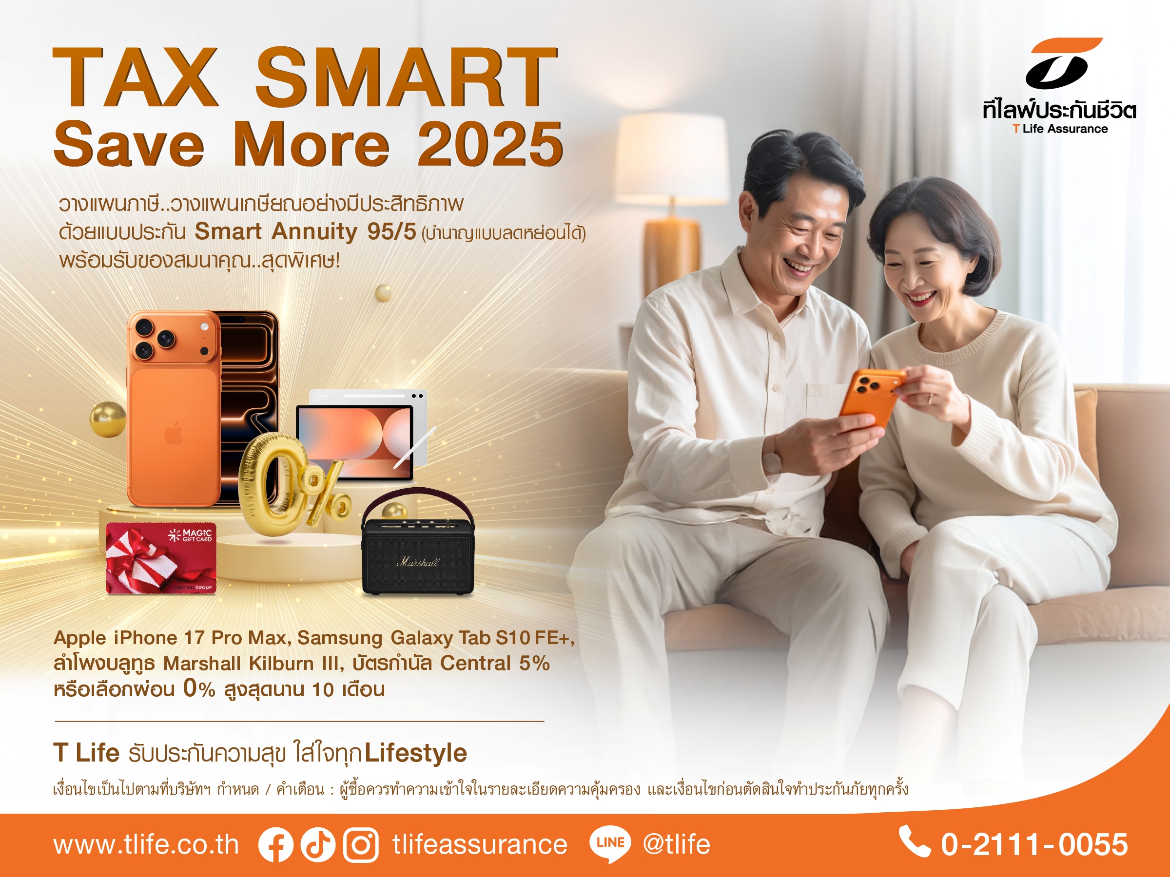 วางแผนภาษีปีนี้ พร้อมรับความมั่นคงในวัยเกษียณกับแบบประกันบำนาญ Smart Annuity 95/5 ได้ที่เว็บไซต์ www.tlife.co.th ตั้งแต่วันนี้ – 31 ธันวาคม 2568 (เงื่อนไขเป็นไปตามที่บริษัทฯ กำหนด) และ