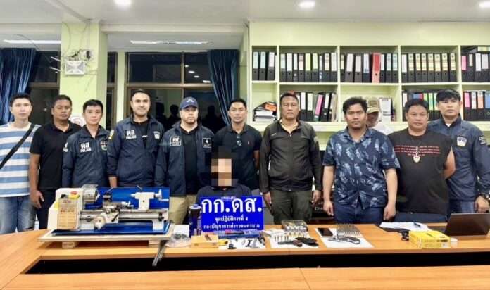 ภายใต้การอำนวยการของ พ.ต.อ.ศานติ กรเกษม ผกก.ดส.บช.น. และผู้บังคับบัญชาชุด ร่วมกับ ชป.4 กก.ดส.บช.น. เมื่อช่วงล่าสุด ชุดปฏิบัติการที่ 4 นำโดย พ.ต.ท.รชต พุ่มพันธุ์ม่วง และ พ.ต.ท.จักรี นารีผล สว.กก.ดส. บช.น. บุกตรวจค้นบริเวณหน้า Sunbeam Hotel เมืองพัทยา อ.บางละมุง จ.ชลบุรี จับกุมตัวนายสมมาตร อายุ 26 ปี พร้อมของกลางจำนวนมากอาทิ กระสุนปืนลูกซอง ขนาดเบอร์ 12 จำนวน 10 นัด อาวุธปืนไทยประดิษฐ์ (แบบหักลำ) ขนาด .38 จำนวน 1 กระบอก เครื่องกระสุนขนาด .38 รวมทั้งสิ้น 64 นัด (แบ่งเป็นหัวตะกั่ว 35 นัด, หัวทองแดง 6 นัด, หัวระเบิดเจาะรู 18 นัด และอีก 5 นัดตามรายการ) เครื่องกลึงลำกล้องปืนยี่ห้อ AllTRCH 1 เครื่อง พร้อมอุปกรณ์อะไหล่และเครื่องมือต่างๆ (ท่อนเหล็ก ท่อนโลหะ ดอกสว่าน ฟันเฟือง ฯลฯ) สิ่งเทียมอาวุธปืน (บีบีกัน) 1 กระบอก โทรศัพท์มือถือยี่ห้อ VIVO รุ่น Y50 และเอกสารการซื้อเครื่องกลึง