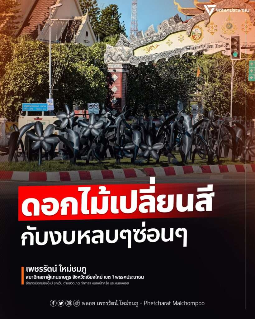 รัฐสภา, วันที่ 29 ต.ค. “พลอย” เพชรรัตน์ ใหม่ชมพู สส.เชียงใหม่ พรรคประชาชน กล่าวถึงกรณีกระแสวิพากษ์วิจารณ์เทศบาลนครเชียงใหม่ที่มีการเปลี่ยนสีประติมากรรมสวนดอกไม้บริเวณเกาะกลางเชิงสะพานนวรัตน์ หรือเกาะกลางใกล้กับจวนผู้ว่าฯ จังหวัดเชียงใหม่ ว่า ปัจจุบันเทศบาลได้รื้อถอนออกไปแล้ว แต่ยังมีคําถามว่างบประมาณที่ใช้ตรงนี้มาจากที่ไหน อย่างไร ตนจึงไปหาข้อมูล