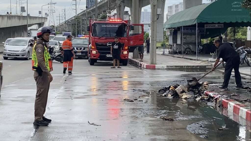 เมื่อเวลา 10.00 น. วันที่ 29 ต.ค. 68 เจ้าหน้าที่ตำรวจสภ.บางศรีเมือง ได้รับแจ้งเหตุรถกระบะขนของเก่าถูกเพลิงลุกไหม้บริเวณท้ายรถ ได้รับความเสียหาย 1 คัน เหตุเกิดบริเวณถนนรัตนาธิเบศร์ (ขาออก) มุ่งหน้าแยกท่าอิฐ ม.3 ต.ไทรม้า อ.เมืองนนทบุรี จ.นนทบุรี จึงพร้อมด้วยอาสาสมัครมูลนิธิร่วมกตัญญู และรถน้ำจากงานป้องกันและบรรเทาสาธารณะภัยเทศบาลเมืองไทรม้า จำนวน 4 คัน รีบรุดไปอำนวยการดับเพลิง