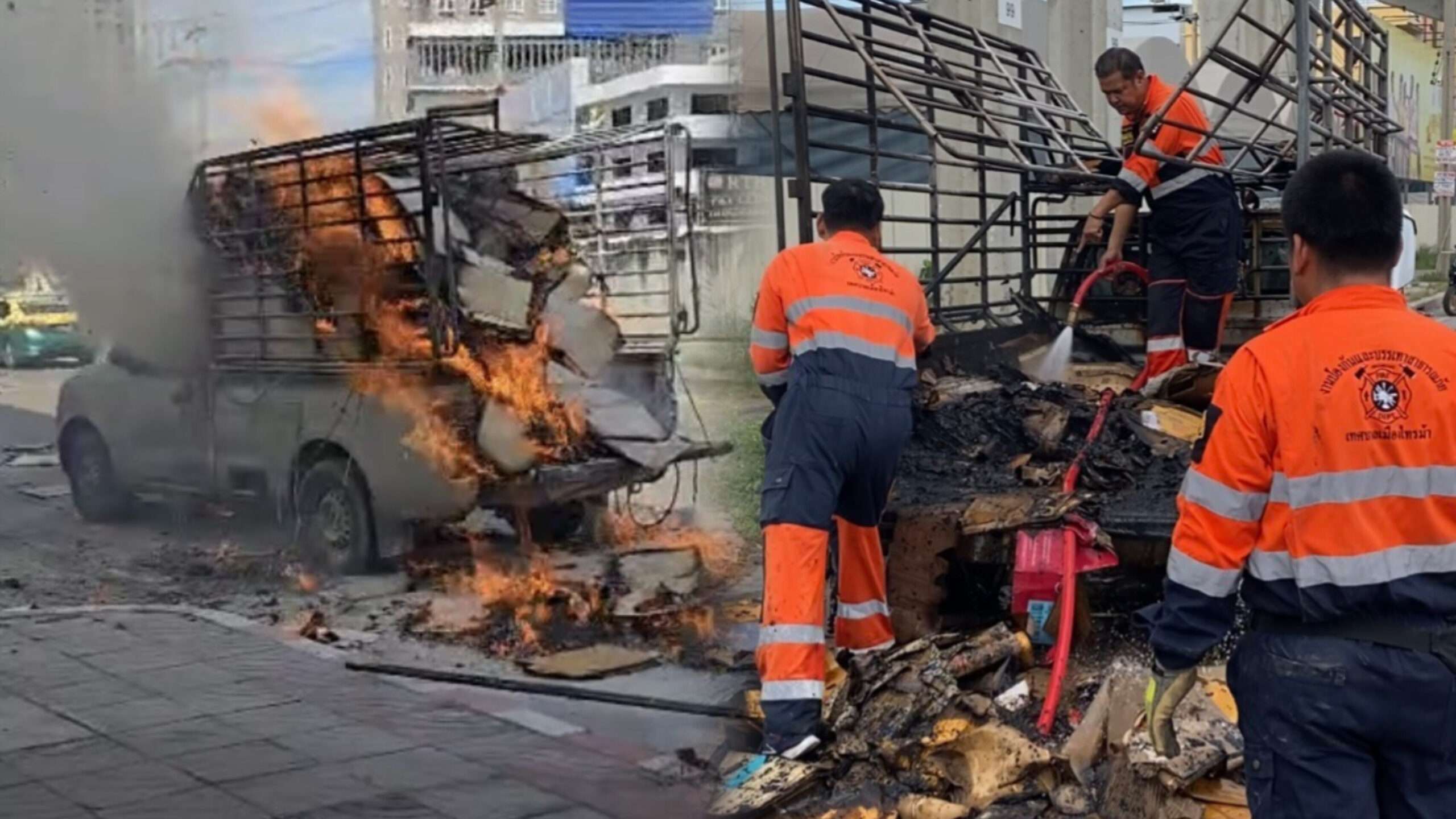 ระทึก! เพลิงไหม้รถกระบะเก็บของเก่าวอด คนขับวิ่งหนีตายลงจากรถ โชคดีไร้คนเจ็บ