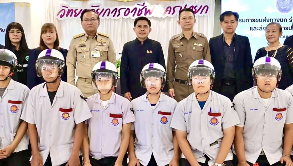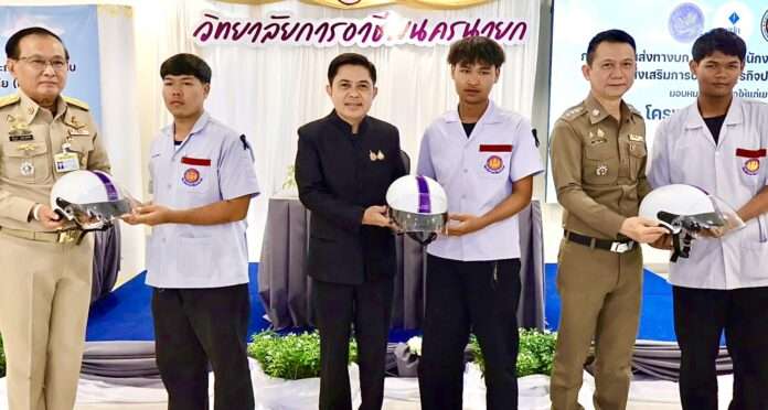 วันที่ 29 ตุลาคม 2568 ที่วิทยาลัยการอาชีพนครนายก สำนักงานขนส่งจังหวัดนครนายก กรมการขนส่งทางบก จัดโครงการ “นักเรียนรุ่นใหม่ ใส่หมวกกันน็อก” เพื่อปลูกฝังวินัยจราจร สร้างจิตสำนึกความปลอดภัย และขับเคลื่อนวัฒนธรรม “ขับขี่ปลอดภัย สวมหมวกทุกครั้ง” ในกลุ่มเยาวชน