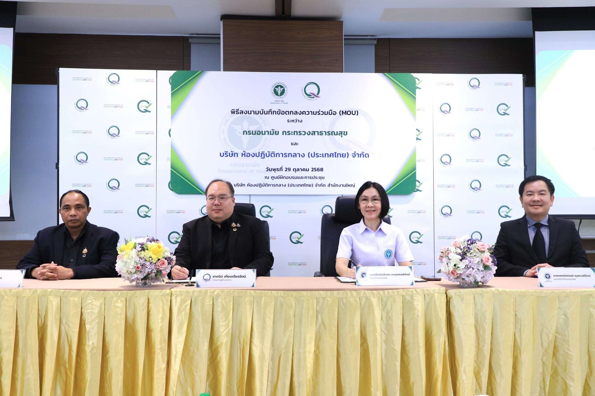วันนี้ (29 ตุลาคม 2568) แพทย์หญิงอัมพร เบญจพลพิทักษ์ อธิบดีกรมอนามัย พร้อมด้วย นายชาคริต เทียบเธียรรัตน์ กรรมการผู้อำนวยการ บริษัท ห้องปฏิบัติการกลาง (ประเทศไทย) จำกัด ร่วมลงนามในบันทึกข้อตกลงความร่วมมือ (MOU) เพื่อสร้างความร่วมมือทั้งทางด้านวิชาการและการตรวจสอบคุณภาพทางห้องปฏิบัติการ ระหว่าง “กรมอนามัย” กับ “CLT” ในการดำเนินการส่งเสริมกิจกรรมตามบทบาทภารกิจของทั้งสองฝ่าย เพื่อให้เกิดประโยชน์และประสิทธิภาพสูงสุด กำหนดแผนดำเนินงานระยะยาวร่วมกัน 5 ปี(พ.ศ 2568 – 2573) สร้างหลักประกันให้คนไทยได้บริโภคอาหารและน้ำดื่มที่สะอาด ปลอดภัย อย่างยั่งยืน ณ บริษัท ห้องปฏิบัติการกลาง (ประเทศไทย) จำกัด