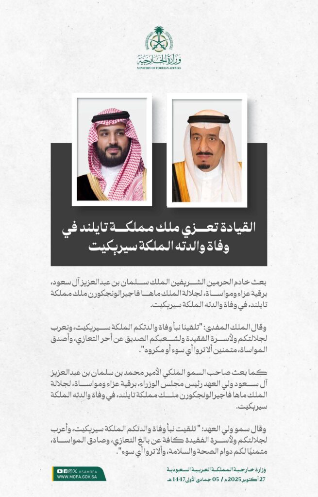 สมเด็จพระราชาธิบดีซัลมาน บิน อับดุลอะซีซ อาล ซะอูด แห่งราชอาณาจักรซาอุดีอาระเบีย ทรงมีพระราชสาส์นแสดงความเสียพระราชหฤทัยมายังพระบาทสมเด็จพระวชิรเกล้าเจ้าอยู่หัวฯ ภายหลังเสด็จสวรรคตของสมเด็จพระนางเจ้าสิริกิติ์ พระบรมราชินีนาถ พระบรมราชชนนีพันปีหลวง
