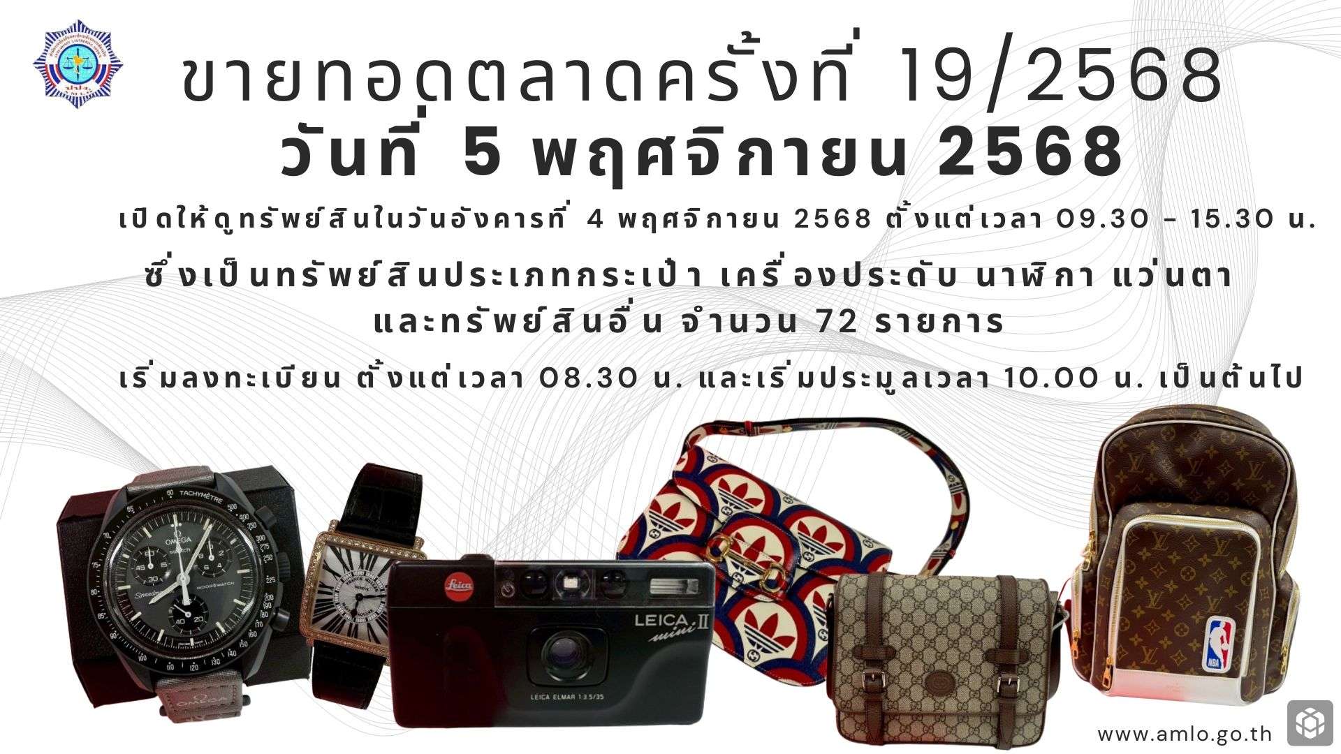 สำนักงาน ปปง. จะทำการขายทอดตลาดทรัพย์สินโดยวิธีการประมูลปากเปล่า ครั้งที่ 19/2568 จำนวน 72 รายการ ซึ่งเป็นทรัพย์สินประเภทกระเป๋า เครื่องประดับ นาฬิกา แว่นตา และทรัพย์สินอื่น ในวันพุธที่ 5 พฤศจิกายน 2568 ลงทะเบียนตั้งแต่เวลา 08.30 น. เริ่มประมูลเวลา 10.00 น. เป็นต้นไป ณ ห้องโถง ชั้น 1 อาคารสำนักงาน ปปง. โดยมีรายการทรัพย์สินที่น่าสนใจ ดังนี้