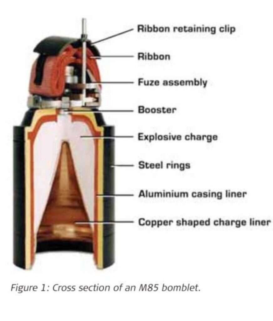 2.โดยการทำงานของกระสุนชนิดนี้ เมื่อยิงถึงเป้าหมายที่กำหนด จะระเบิดและปล่อยลูกระเบิดย่อยแบบ M85 ออกมา ซึ่งลูกระเบิดย่อยจะทำงานและระเบิดตัวเองโดยอัตโนมัติ ไม่มีการตกค้างในพื้นที่ และไม่มีส่วนประกอบของลูกปราย (ลูกเหล็กทรงกลม) ภายในระเบิด 3.จากภาพหลักฐานที่กัมพูชาเผยแพร่ พบว่าลักษณะความเสียหายไม่สอดคล้องกับระเบิดแบบ M85 โดยภาพที่ปรากฏแสดงให้เห็นหลังคาบ้านและโอ่งน้ำมีรูพรุนจำนวนมาก รวมทั้งพบร่องรอยสะเก็ดระเบิดทั่วไป ซึ่งไม่ใช่ลักษณะของระเบิดแรงสูงแบบ Shaped Charge ที่มักก่อให้เกิดการลุกไหม้หรือหลอมละลายของพื้นผิววัตถุ ทั้งนี้ ระเบิดแบบ M85 ไม่มีคุณสมบัติสร้างสะเก็ดจำนวนมากเช่นที่ปรากฏในภาพ