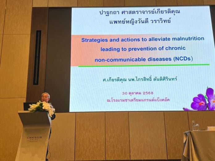 วันที่ 30 ตุลาคม 2568 ศาสตราจารย์เกียรติคุณ นายแพทย์ ไกรสิทธิ์ ตันติศิรินทร์ อดีตสมาชิกวุฒิสภา (สว.) ร่วมปาฐกถาหัวข้อ “ยุทธศาสตร์และการขจัดทุพโภชนาการ(ทั้งขาดและเกิน) เพื่อนำไปสู่การป้องกันโรคไม่ติดต่อเรื้อรัง (NCDs)” ในงานศาสตราจารย์เกียรติคุณ แพทย์หญิง วันดี วราวิทย์ จัดโดยสมาคมกุมารแพทย์ทางเดินอาหารและตับแห่งประเทศไทย มีผู้เข้าร่วม 170 คน ณ Chatrium Grand Bangkok Hotel