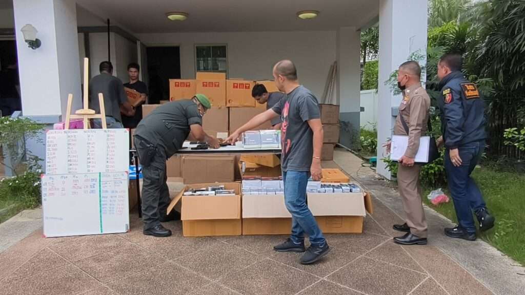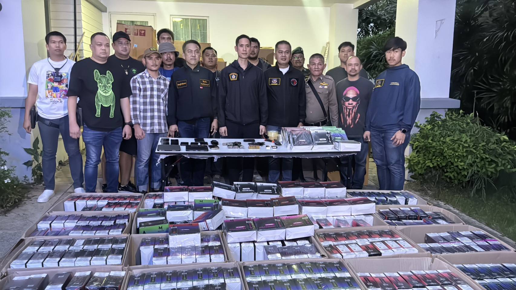 จากการตรวจค้นบ้านเดี่ยว 2 ชั้น พื้นที่ใช้สอยประมาณ 180 ตารางเมตร เจ้าหน้าที่พบของกลางเป็นบุหรี่ไฟฟ้าและน้ำยาบุหรี่ไฟฟ้าจำนวนประมาณ 70,000–80,000 ชิ้น รวมมูลค่าประมาณ 24,000,000 บาท พร้อมอาวุธปืนพกสั้น 2 กระบอก ได้แก่ 1.ปืนพกสั้น Sig Sauer รุ่น P365 ขนาด 9 มม. จำนวน 1 กระบอก 2.ปืนพกสั้น Sig Sauer รุ่น P938 ขนาด 9 มม. จำนวน 1 กระบอก พร้อมเครื่องกระสุนปืนอีกหลายรายการ รวมทั้งโทรศัพท์มือถือ 8 เครื่อง