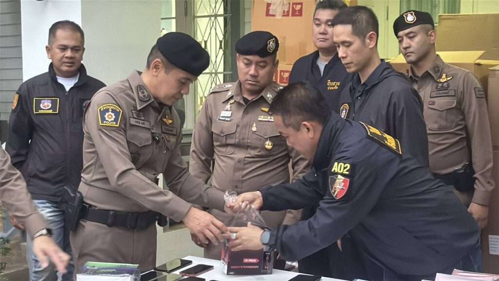 เมื่อเวลา 15.00 น. วันที่ 31 ต.ค. 68 พล.ต.ต.อรรถพล อนุสิทธิ์ รอง ผบช.ภ.1, พล.ต.ต.เดชรพี คงดี ผบก.ภ.จว.นนทบุรี, พ.ต.อ.จิรายุส วานิชกูล ผกก.สส.ภ.จว.นนทบุรี และ พ.ต.ท.ศุภชัย ศรีศักดิ์ รอง ผกก.สส.ภ.จว.นนทบุรี พร้อมเจ้าหน้าที่ตำรวจ สภ.ปากเกร็ด และหน่วยปฏิบัติการพิเศษ (นปพ.) ภ.จว.นนทบุรี นำกำลังเข้าตรวจค้นบ้านหรูภายในหมู่บ้านแห่งหนึ่งริมถนนเลียบคลองประปา ตำบลบางตลาด อำเภอปากเกร็ด จังหวัดนนทบุรี ตามหมายค้นศาลจังหวัดนนทบุรี ที่ 939/2568 ลงวันที่ 31 ตุลาคม 2568 หลังได้รับรายงานว่ามีการลักลอบจำหน่ายบุหรี่ไฟฟ้าในพื้นที่