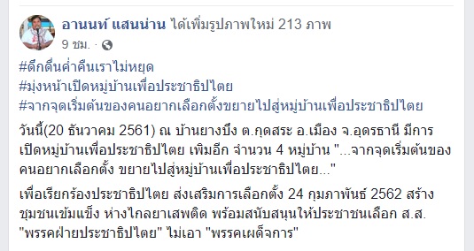 ผู้สื่อข่าวรายงานว่า นายอานนท์ แสนน่าน ผู้ก่อตั้งหมู่บ้านเสื้อแดง ในฐานะประธานหมู่บ้านเพื่อประชาธิปไตยแห่งประเทศไทย โพสต์ข้อความเกี่ยวกับความเคลื่อนไหวการเปิดหมู่บ้านเพื่อประชาธิปไตย ผ่านเฟซบุ๊ค ระบุว่า #ดึกดื่นค่ำคืนเราไม่หยุด #มุ่งหน้าเปิดหมู่บ้านเพื่อประชาธิปไตย #จากจุดเริ่มต้นของคนอยากเลือกตั้งขยายไปสู่หมู่บ้านเพื่อประชาธิปไตย