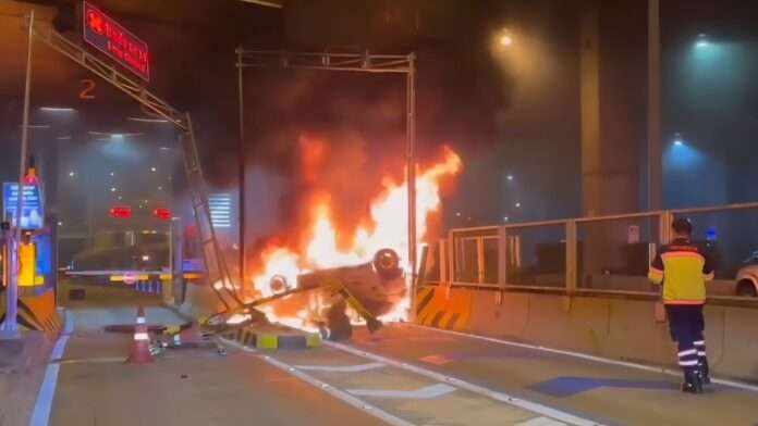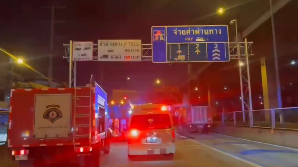 เมื่อเวลา 04.49 น. วันที่ 1 พ.ย.68 ตำรวจ สน.วิภาวดี รับแจ้งเหตุเพลิงไหม้รถยนต์ บริเวณด่านแจ้งวัฒนะ 1 ทางยกระดับอุตราภิมุข หรือดอนเมืองโทลล์เวย์ ถนนวิภาวดีรังสิต ขาเข้า แขวงตลาดบางเขน เขตหลักสี่ กทม. จึงรุดไปตรวจสอบพร้อมหน่วยกู้ภัยทางยกระดับอุตราภิมุข และเจ้าหน้าที่สถานีดับเพลิงบางเขน รถน้ำ 1 คัน ที่เกิดเหตุช่องที่ 3 เก็บค่าผ่านทาง พบรถยนต์ ยี่ห้อฮอนด้า แจ๊ส สีเทา หมายทะเบียน 5 กน 1500 กทม. สภาพหงายท้องล้อชี้ฟ้าเพลิงลุกไหม้รุนแรง เจ้าหน้าที่จึงใช้น้ำฉีดประมาณ 10 นาทีเพลิงสงบลง รถยนต์วอดเสียหายทั้งคัน มีเสาเหล็กป้ายหักโค่นและเพดานกันสาดเสียหาย จึงบันทึกรวบรวมที่เกิดเหตุไว้เป็นหลักฐาน