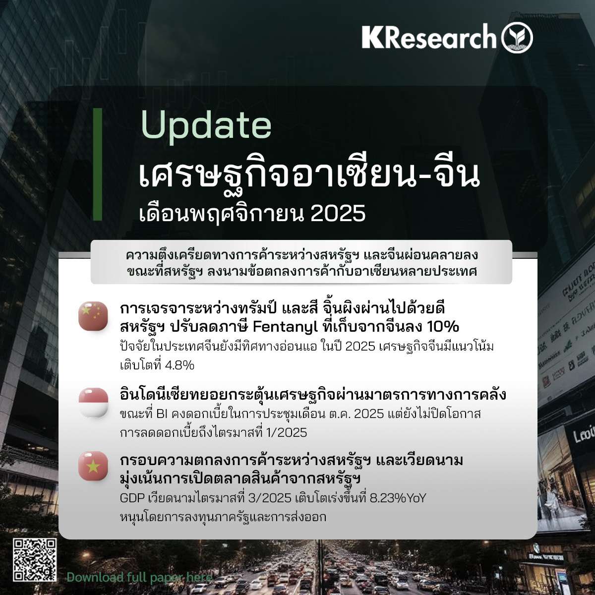 กรุงเทพฯ, วันที่ 3 พ.ย. – ศูนย์วิจัยกสิกรไทย ประเมินสถานการณ์ทางเศรษฐกิจของอาเซียน-จีน เดือนพฤศจิกายน 2568 ว่า ในส่วนของประเทศจีน การเจรจาระหว่างประธานาธิบดีโดนัลด์ ทรัมป์ แห่งสหรัฐฯ กับประธานาธิบดี สี จิ้นผิง ของจีนผ่านไปด้วยดี สหรัฐฯ ปรับลดภาษี Fentanyl ที่เก็บจากจีนลง 10% ทว่าปัจจัยในประเทศจีนยังมีทิศทางอ่อนแอ ทำให้ในปีนี้ เศรษฐกิจจีนมีแนวโน้มเติบโตที่ 4.8%