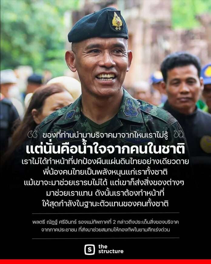 พลตรี ณัฎฐ์ ศรีอินทร์ รองแม่ทัพภาคที่ 2 กล่าวถึงประเด็นสิ่งของบริจาคจากภาคประชาชน ที่ส่งมาช่วยสมทบให้กองทัพในยามศึกเร่งด่วน โดยได้อธิบายประเด็นต่าง ๆ ในเฟซบุ๊กส่วนตัว (2 พ.ย.2568) ว่า