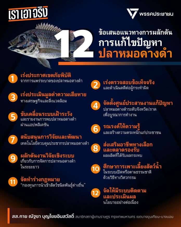 วันที่ 4 พฤศจิกายน 2568 นายณัฐชา บุญไชยอินสวัสดิ์ สส.กทม. พรรคประชาชน ได้ออกมาเปิดเผยถึงสถานการณ์การแพร่ระบาดของปลาหมอคางดำว่าปัจจุบันมีการแพร่ระบาดเพิ่มขึ้นอย่างต่อเนื่องในหลายจังหวัด ไม่ได้มีจำนวนลดน้อยถอยลงไปแต่อย่างใด พี่น้องเกษตรกรยังคงได้รับผลกระทบมากมาย ปัญหาชีวิตรุมเร้า ภาครัฐไม่มีมาตรการเยียวยาผลกระทบใด ๆ จนหลายคนต้องตัดสินใจจบชีวิตของตัวเอง.ตลอดระยะเวลาที่ผ่านมา กระทรวงเกษตรฯ แสดงท่าทีเหมือนจะจริงจังกับการแก้ปัญหาไขปัญหามากขึ้น แต่พอเปลี่ยนจากการเป็นรัฐมนตรีเงา ที่คอยสั่งการอยู่เบื้องหลัง มาเป็นรัฐมนตรีตัวจริง คุยโวว่าตนเองเป็นคนจุดประเด็น พร้อมพูดเสียงดังฟังชัดท่าทีขึงขังว่าจะประกาศสงครามกับปลาหมอคางดำ แต่ในท้ายที่สุดกลับนิ่งเงียบเหมือนเดิม ไม่ได้มีมาตรการที่เป็นรูปธรรมออกมาช่วยเหลือเกษตรกรแม้แต่น้อย ทั้งที่ความเสียหายกำลังลุกลามในหลายจังหวัด โดยเฉพาะในพื้นที่ลุ่มน้ำภาคกลางและภาคตะวันออก