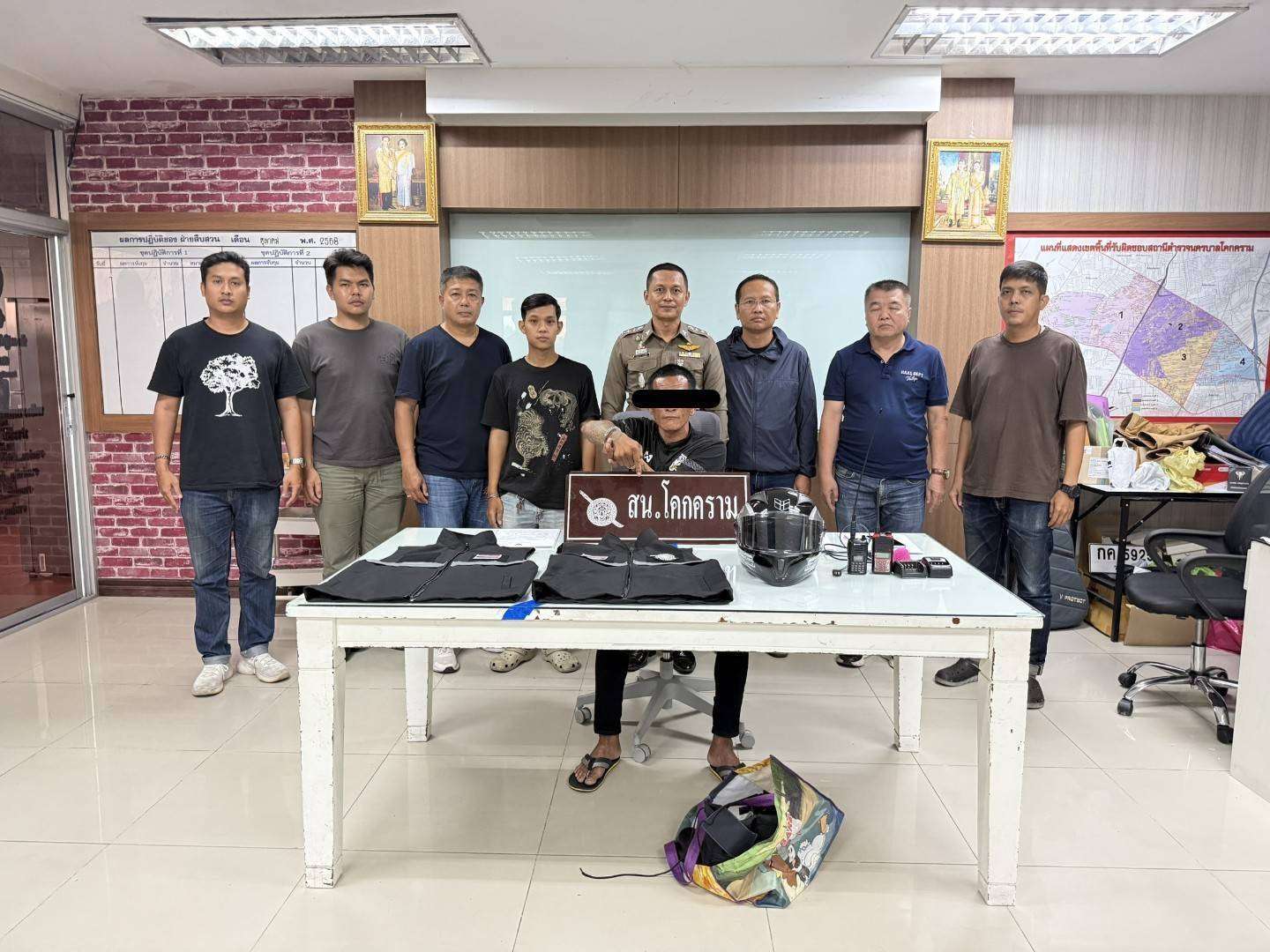 ฝ่ายสืบสวน สน.โคกคราม ได้จับกุมนายไพรัตน์ คล้อยเจริญ อายุ 38 ปี พร้อมด้วยของกลาง เสื้อกั๊กสีดำ จำนวน 2 ตัว หลังได้รับแจ้งเหตุจากนายซูเพียน ตือราเฮง อายุ 19 ปี ผู้เสียหาย แจ้งว่าขณะปฎิบัติหน้าที่รักษาความปลอดภัย หมู่บ้านย่านลาดปลาเค้า คนร้ายเป็นชายได้ขี่รถจักรยานยนต์ไม่ทราบหมายเลขทะเบียนมาจอดหน้าหมู่บ้าน แล้วลงรถเดินเข้ามาหา จากนั้นได้ชักอาวุธปืนข่มขู่ ได้เอาโทรศัพท์มือถือไอโฟน 11 สีเขียว จำนวน 1 เครื่องและบัตรประชาชนผู้เสียหายไป จากนั้นได้ขี่รถจักรยานยนต์หลบหนีไป