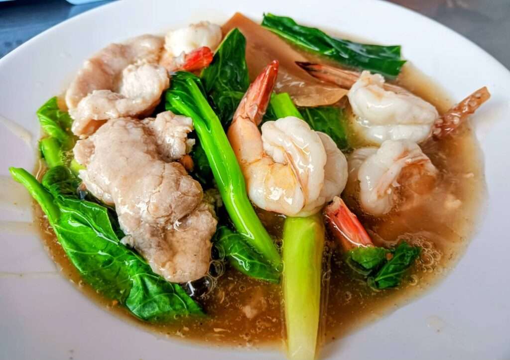 เมนูที่ 2 ก๋วยเตี๋ยวราดหน้าทะเลรวม ราคา 80 บาทเช่นกัน กุ้งแชบ๊วยทะเลตัวใหญ่ ปลาหมึกกกรอบชิ้นใหญ่ และหมูนุ่มๆ รสชาติของน้ำราดหน้า ยังคงรักษาเอกลักษณ์ของความอร่อยได้เป็นอย่างดี