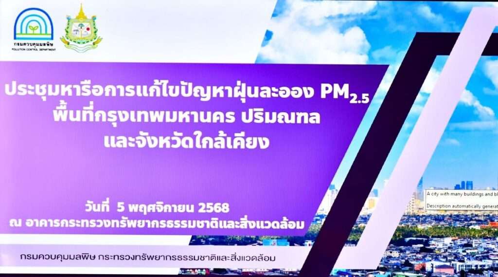 วันนี้ (5 พฤศจิกายน 2568) นายสุชาติ ชมกลิ่น รองนายกรัฐมนตรี และรัฐมนตรีว่าการกระทรวงทรัพยากรธรรมชาติและสิ่งแวดล้อม มอบหมายให้ ดร.ชญานันท์ ภักดีจิตต์ ปลัดกระทรวงทรัพยากรธรมชาติและสิ่งแวดล้อม เป็นประธานในการประชุมหารือการแก้ไขปัญหาฝุ่นละออง PM 2.5 พื้นที่กรุงเทพมหานคร ปริมณฑล และจังหวัดใกล้เคียง โดยมีหน่วยงานราชการ อาทิ กรุงเทพมหานคร กระทรวงเกษตรและสหกรณ์ กระทรวงอุตสาหกรรม กรมการขนส่งทางบก และผู้ว่าราชการจังหวัดใกล้เคียงกรุงเทพมหาคร เข้าร่วม ณ ห้องประชุม 202 ชั้น 2 กระทรวงทรัพยากรธรรมชาติและสิ่งแวดล้อม