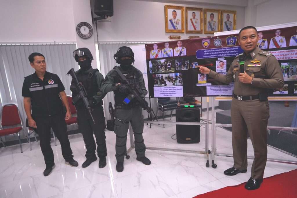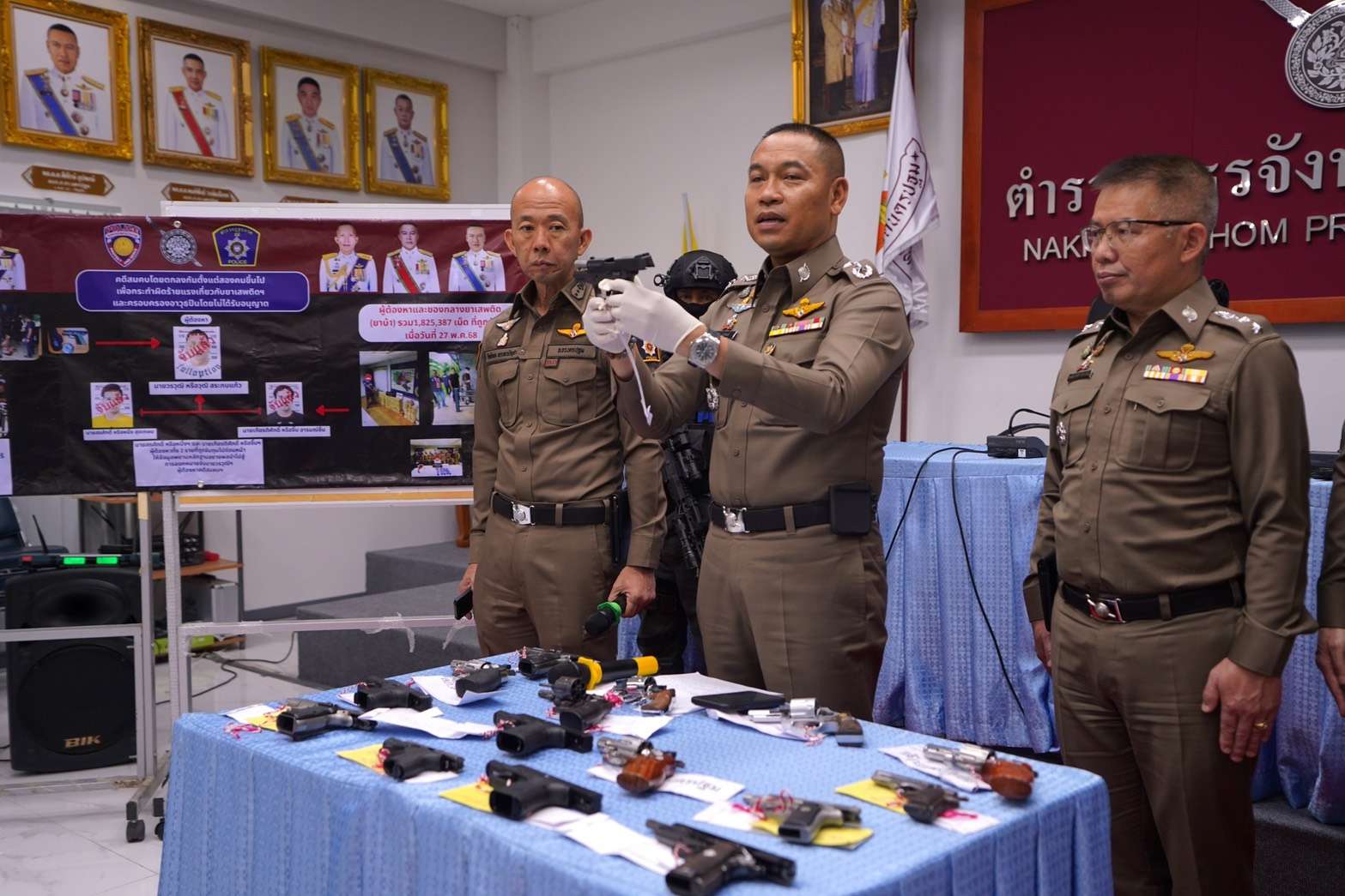 ที่กองบังคับการตำรวจภูธรจังหวัดนครปฐม (บก.ภ.จว.นครปฐม) วันที่ 5 พฤศจิกายน – พล.ต.ต.พิทักษ์ อุปพงษ์ ผบก.ภ.จว.นครปฐม พร้อมด้วย พ.ต.อ.อิทธิพล พรเทวบัญชา รอง ผบก.ภ.จว.นครปฐม พ.ต.อ.ปิโยรส กัณหะสิริ ผกก.สืบสวน ภ.จว.นครปฐม พ.ต.ท.เมธาสิทธิ์ ผุยหนองโพธิ์ รอง ผกก.สืบสวน ภ.จว.นครปฐม พ.ต.ท.ณรงค์ แก้วศรี รอง ผกก.สืบสวน ภ.จว.นครปฐม พ.ต.ท.รุ่งธรรม เมษะยศพัฒน์ สว.สส. กก.สืบสวน ภ.จว.พ.ต.ต.จตุพล บัวโพธิ์ สว.สส.(นปพ.) กก.สืบสวน ภ.จว.นครปฐม ร.ต.อ.วราเสฏฐ์ กลั่นหวาน รอง สว.สส. กก.สืบสวน ภ.จว.นครปฐม ร.ต.อ.สัญญา สายจีน รอง สว.สส. กก.สืบสวน ภ.จว.นครปฐม พร้อมด้วยชุดจับกุม ร่วมกันแถลงผลการขยายผลจับกุมนายเกียรติศักดิ์ หรือจิ๊บ อารมณ์ชื่น พร้อมของกลาง ยาบ้าจำนวน 1,820,000 เม็ด พร้อมอาวุธปืนจำนวนหนึ่ง เหตุเกิดที่ บ้านเช่าเลขที่ 177 ม.5 ต.ทุ่งกระพังโหม อ.กำแพงแสน จ.นครปฐม เมื่อวันที่ 27 พฤษภาคม ที่ผ่านมา