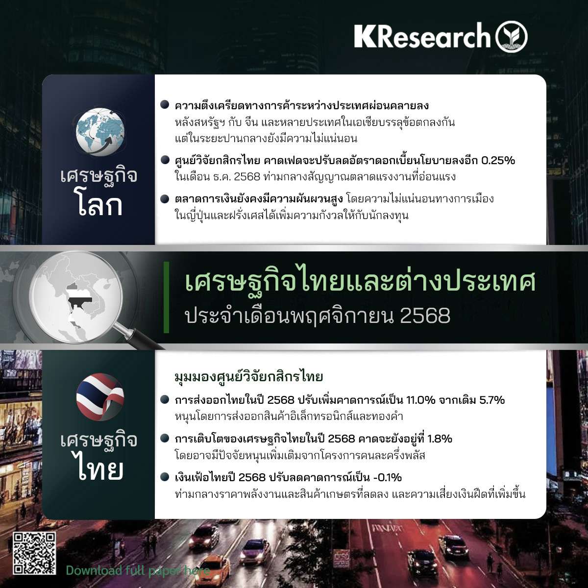 ด้านสถานการณ์เศรษฐกิจไทย ศูนย์วิจัยกสิกรไทย ชี้ว่า การส่งออกไทยในปี 2568 ปรับเพิ่มคาดการณ์เป็น 11.0% จากเดิม 5.7% หนุนโดยการส่งออกสินค้าอิเล็กทรอนิกส์และทองคำ ขณะที่การเติบโตของเศรษฐกิจไทยในปี 2568 คาดจะยังอยู่ที่ 1.8% โดยอาจมีปัจจัยหนุนเพิ่มเติมจากโครงการคนละครึ่งพลัส ส่วนเงินเฟ้อไทยปี 2568 ปรับลดคาดการณ์เป็น -0.1% ท่ามกลางราคาพลังงานและสินค้าเกษตรที่ลดลง และความเสี่ยงเงินฝืดที่เพิ่มขึ้น