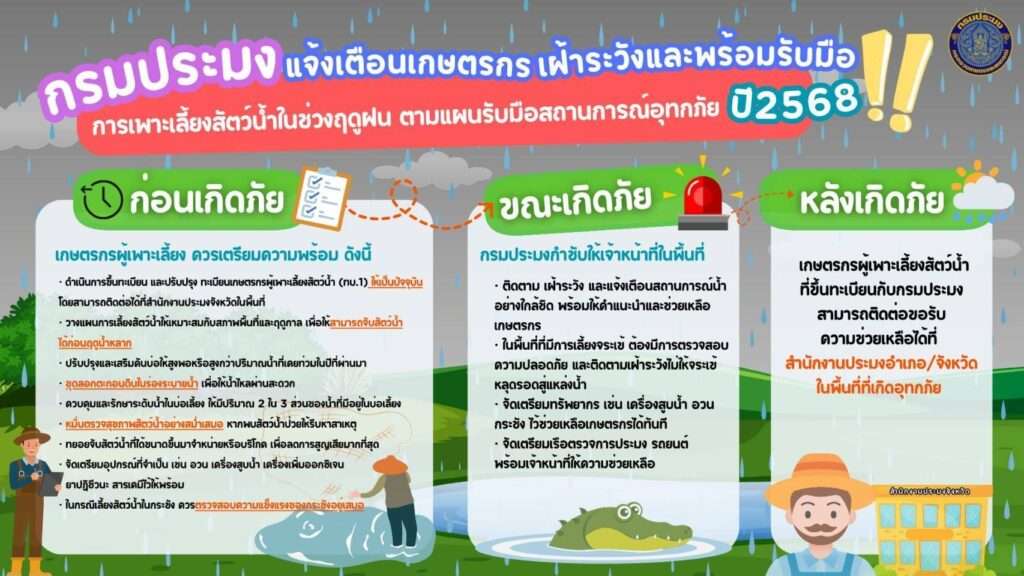 นางฐิติพร หลาวประเสริฐ อธิบดีกรมประมง เปิดเผยว่า ในห้วงเวลาปัจจุบันประเทศไทยกำลัง เผชิญกับสภาพอากาศแปรปรวนมีฝนตกชุกในหลายพื้นที่ ส่งผลกระทบถึงเกษตรกรผู้เพาะเลี้ยงสัตว์น้ำ รวมถึงขณะนี้มีประกาศแจ้งเตือนจากกรมอุตุนิยมวิทยา เรื่อง อิทธิพลของพายุไต้ฝุ่น “คัลแมกี” ส่งผลให้ในช่วงวันที่ 7–9 พ.ย. 68 ประเทศไทยตอนบนมีฝนเพิ่มขึ้น และมีฝนตกหนักถึงหนักมากบางพื้นที่ โดยจะเริ่มจากบริเวณภาคตะวันออกเฉียงเหนือ ภาคตะวันออก ภาคกลาง และภาคเหนือตามลำดับ ซึ่งอาจทำให้เกิดน้ำท่วมฉับพลัน น้ำป่าไหลหลาก และน้ำล้นตลิ่ง