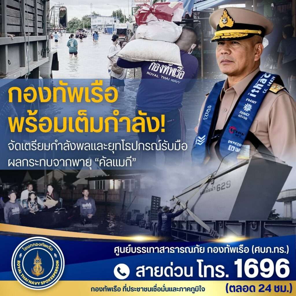 พลเรือตรี ปารัช รัตนไชยพันธ์ โฆษกกองทัพเรือ ได้กล่าวถึงการเตรียมความพร้อมของกองทัพเรือในการให้ความช่วยเหลือประชาชนที่ได้รับผลกระทบจาก พายุไต้ฝุ่น “คัลแมกี” ตามที่กรมอุตุนิยมวิทยาได้ประกาศแจ้งเตือน โดยพายุฯ ได้อ่อนกำลังลงและกำลังจะเคลื่อนเข้าปกคลุมประเทศไทย ส่งผลให้ระหว่างวันที่ 7 – 9 พฤศจิกายน 2568 ประเทศไทยตอนบนมีฝนเพิ่มขึ้นและมีฝนตกหนักถึงหนักมากบางพื้นที่ โดยจะเริ่มจากบริเวณภาคตะวันออกเฉียงเหนือ ภาคกลาง และภาคเหนือตามลำดับ สำหรับคลื่นลมบริเวณทะเลจะมีกำลังค่อนข้างแรง โดยมีคลื่นสูง 2 – 3 เมตร