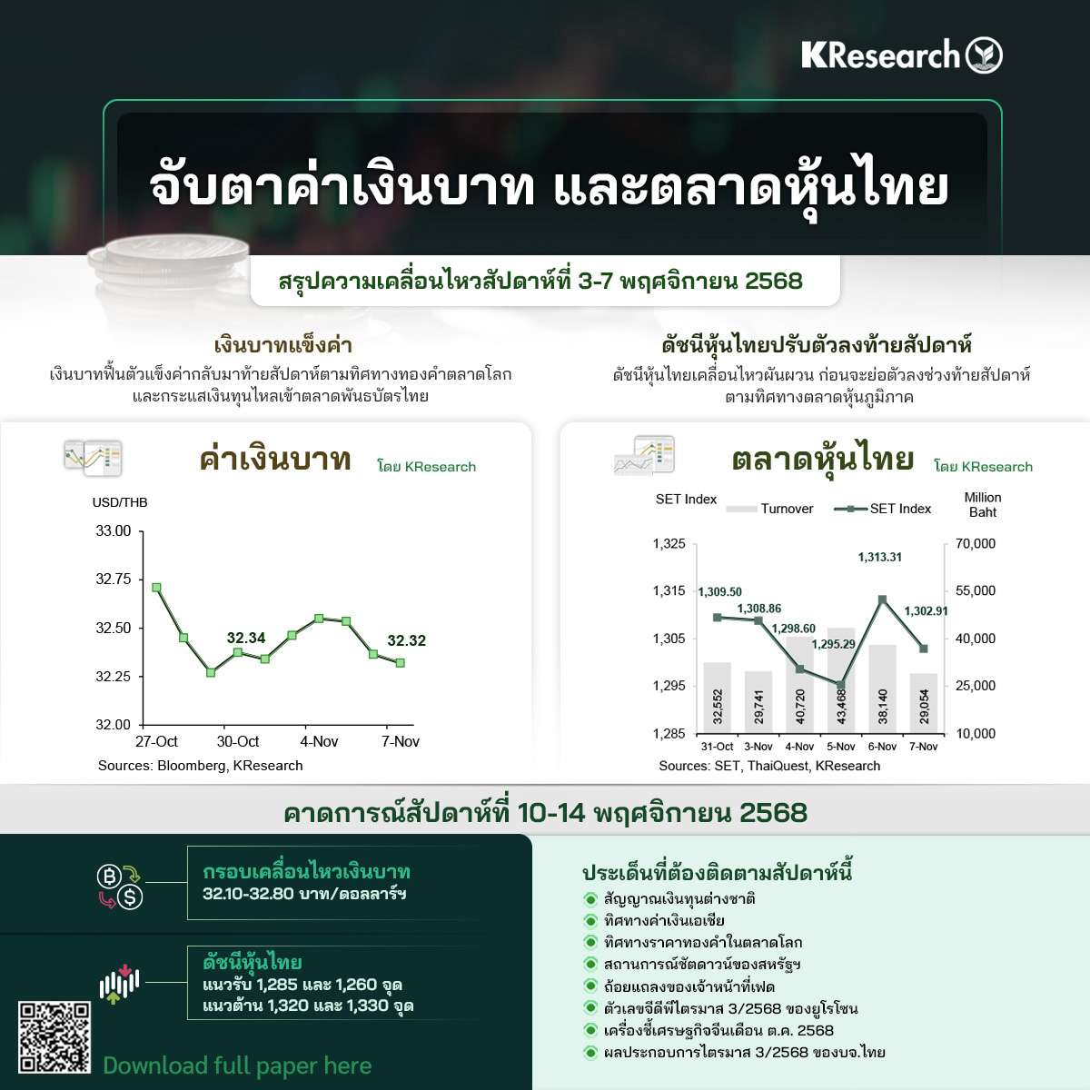 โดยสัปดาห์หน้า (10-14 พ.ย.) ศูนย์วิจัยกสิกรคาดกรอบการเคลื่อนไหวของเงินบาทที่ 32.10-32.80 บาท/ดอลลาร์ฯ ส่วนดัชนีหุ้นไทย แนวรับที่ 1,285 และ 1,260 จุด แนวต้าน 1,320 และ 1,330 จุด