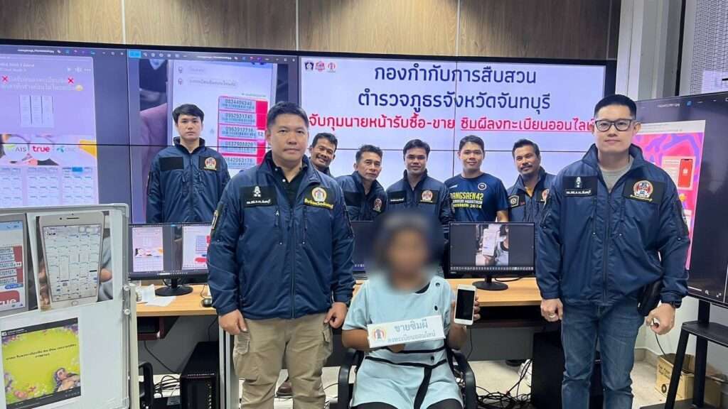 จับกุมนายหน้ารับซื้อ-ขายซิมผี ลงทะเบียนออนไลน์ เจ้าหน้าที่ตำรวจ กก.สส.ภ.จว.จันทบุรี ร่วมกันจับกุม น.ส.พรนภา หรือมิ้น อายุ 25 ปี ในความผิดฐาน “เป็นธุระจัดหา โฆษณา หรือไขข่าวโดยประการใด ๆ เพื่อให้มีการซื้อหรือขายเลขหมายโทรศัพท์สำหรับบริการโทรศัพท์เคลื่อนที่ ซึ่งลงทะเบียนผู้ใช้บริการในนาม ของบุคคลหนึ่งบุคคลใดแล้ว แต่ไม่สามารถระบุตัวผู้ใช้บริการได้” พร้อมยึดของกลาง โทรศัพท์ยี่ห้อ Apple รุ่น Iphon8 Plus สีชมพู จํานวน 1 เครื่อง