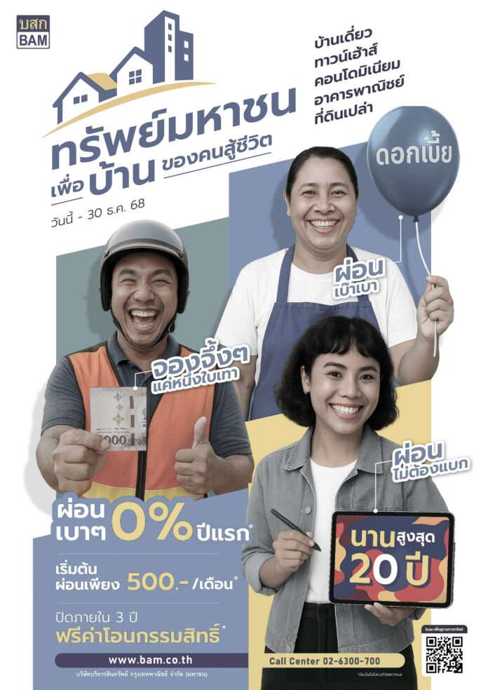 โครงการทรัพย์มหาชน เพื่อบ้านของคนสู้ชีวิต เปิดตัวเมื่อวันที่ 1 ตุลาคม 2568 ใช้เวลาเพียง 1 เดือน BAM สามารถช่วยให้ 285 ครอบครัว มีบ้านเป็นของตนเอง และภายในสิ้นเดือนธันวาคมนี้คาดว่าจะสามารถทำให้อีกไม่ต่ำกว่า 700 ครอบครัวได้เป็นเจ้าของทรัพย์มหาชนของ BAM ความสำเร็จของโครงการนี้ เป็นคำตอบของการสร้างสมดุลระหว่างกำไรทางธุรกิจและสังคมได้เป็นอย่างดี ในแง่ของการบริหารจัดการทรัพย์สินรอการขาย เราสามารถระบายทรัพย์เหล่านี้ออกไปทำให้ลดค่าใช้จ่ายในการถือครองได้อย่างมีประสิทธิภาพ ขณะเดียวกันยังเป็นการช่วยเหลือกลุ่มคนตัวเล็กให้เป็นเจ้าของที่อยู่อาศัยด้วยเงื่อนไขที่ผ่อนปรน
