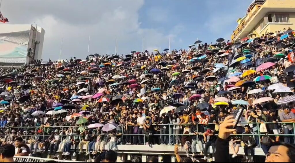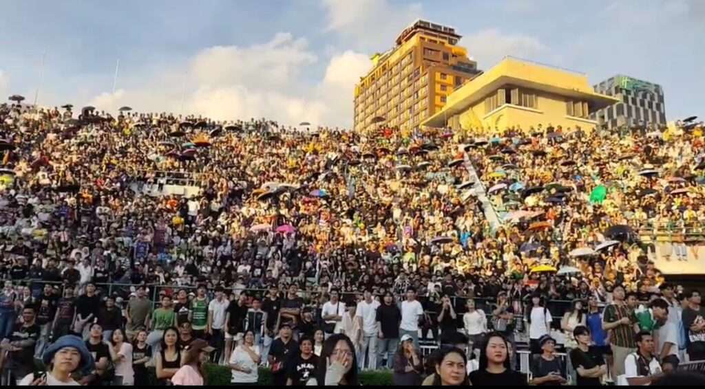 บรรยากาศวันนี้มีผู้คน ประชาชนทั้งนักเรียนและผู้ใหญ่ จำนวนมากแห่แหนต่างเข้ามาเชียร์ทีมที่ตนรัก เนืองแน่นสนามกีฬาแห่งชาติ