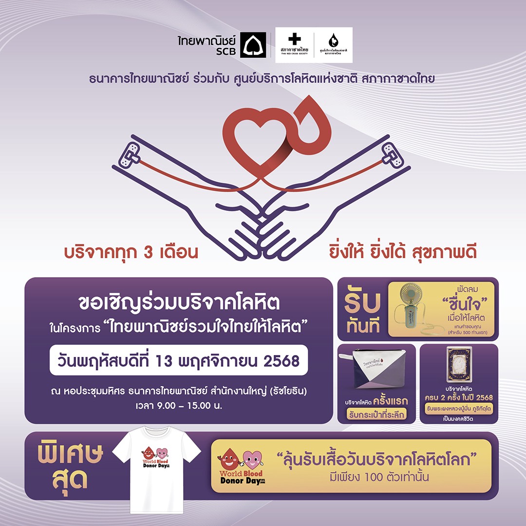 กลุ่มเอสซีบีเอกซ์ โดยธนาคารไทยพาณิชย์ ร่วมกับ ศูนย์บริการโลหิตแห่งชาติ สภากาชาดไทย ขอเชิญร่วมบริจาคโลหิต เติมเต็มปริมาณโลหิตสำรองคงคลัง ภายใต้โครงการ “ไทยพาณิชย์รวมใจไทยให้โลหิต” ในวันพฤหัสบดีที่ 13 พฤศจิกายน 2568 เวลา 9.00-15.00 น. ณ หอประชุมมหิศร ธนาคารไทยพาณิชย์ สำนักงานใหญ่ (รัชโยธิน) เพื่อส่งต่อโลหิตที่มีคุณภาพให้มีเพียงพอต่อการรักษาพยาบาลผู้ป่วยทั่วประเทศ ยังมีผู้ป่วยจำนวนมากที่กำลังรอรับโลหิตเพื่อต่อลมหายใจ การบริจาคโลหิต 1 ครั้ง สามารถนำไปช่วยชีวิตผู้ป่วยได้มากกว่า 3 ชีวิต สำหรับผู้ที่บริจาคโลหิตครั้งแรกรับทันทีกระเป๋าที่ระลึก บริจาคโลหิตครบ 2 ครั้งในปี 2568 รับพระผงหลวงปู่มั่น ภูริทตฺโต เป็นมงคลชีวิต และ 500 ท่านแรกที่ร่วมบริจาคโลหิต รับพัดลม “ชื่นใจ” แทนคำขอบคุณ พร้อมลุ้นรับเสื้อวันบริจาคโลหิตโลกมีเพียง 100 ตัวเท่านั้น