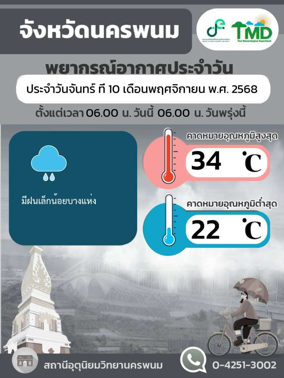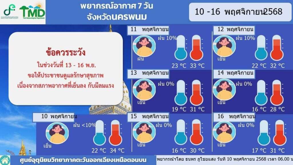 ศูนย์อุตุนิยมวิทยาภาคตะวันออกเฉียงเหนือตอนบน พยากรณ์อากาศจังหวัดนครพนม 7 วัน ตั้งแต่วันที่ 10-16 พฤศจิกายน 2568