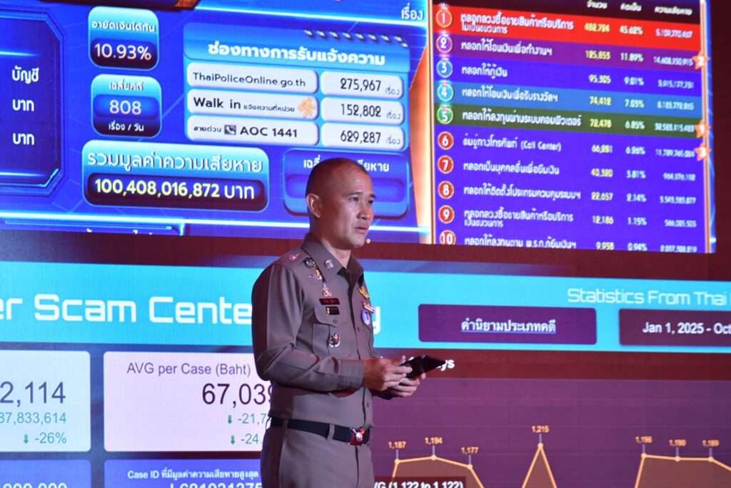 พล.ต.ท.จิรภพ ภูริเดช ผู้ช่วยผู้บัญชาการตำรวจแห่งชาติ กล่าวว่า สถานการณ์ Cyber Scammer มีความรุนแรงจนส่งผลกระทบไปทั่วโลก ซึ่งจากสถิติ Global Anti-Scam Alliance (GASA) พบการโจมตีนานาประเทศทั่วโลก มูลค่าสูงถึง 1.03 trillion USD หรือคิดเป็น 1 ล้านล้านบาท ภูมิภาคเอเชียได้รับผลกระทบมากที่สุด 688,000,000,000 USD โดยประเทศจีนโดนหนักสุด อาทิ ที่เมืองเล่าก์ก่าย (Laukkaing) พบมีอาคารสูงทันสมัยเป็นฐานการทำงานของสแกมเมอร์มากถึง 6 อาคาร ซึ่งมีคนร้ายถูกจับกุม 5,000 กว่าคน ในจำนวนนั้นเป็นคนไทยประมาณ 500 คน ที่ได้ได้ถูกส่งตัวกลับมายังประเทศไทยแล้ว หรือที่สหรัฐอเมริกาได้รับผลกระทบ 12,500,000,000 USD ซึ่งเป็นความเสียหายรุนแรง รวมถึงประเทศสิงคโปร์ ได้รับผลกระทบมากถึง 1,200,000,000 บาท ในส่วนของประเทศไทยตลอด 3 ปี มีสถิติสะสมประมาณ 1,000,000 เคส ความเสียหายมากกว่า 100,000 ล้านบาท มีรับแจ้งเหตุใหม่ 300,000 เคส ความเสียหาย 20,000 ล้านบาท และในแต่ละวันจะมีเหตุใหม่ วันละมากกว่า 3,000 เรื่อง ความเสียหายวันละกว่า 70,000,000 บาท (+,-) โดยการแก้ปัญหาเหล่านี้ต้องแก้จากต้นเหตุ เช่น การเจรจาหรือกดดันประเทศที่เป็นฐานแกมเมอร์ด้วยวิธีการต่าง ๆ อาทิ การเชิญชวนนานาประเทศร่วมกันลงพื้นที่ไปในพื้นที่ที่เป็นต้นเหตุ ทำให้เขาให้ความร่วมมืออย่างจริงจังและจริงใจ รวมถึงการแทรกแซง เช่น การตัดอินเตอร์เน็ต ไฟฟ้า น้ำมัน เพื่อกดดันให้ให้ประเทศเหล่านั้นรับผิดชอบ แต่หากประเทศเหล่านั้นไม่ร่วมมือ เราก็ต้องทำทุกวิถีทางเพื่อให้คนไทยปลอดภัย สังคมไทยอยู่ได้อย่างผาสุก ความร่วมมือภายในและภายนอกประเทศจะนำไปสู่ความสำเร็จในการปราบปราม แต่ต้องใช้เวลาในการขับเคลื่อน ซึ่ง 1 เดือนที่ผ่านมาเราได้เห็นความเปลี่ยนแปลง และเราจะสู้อย่างเต็มที่ด้วยศักยภาพของทุกคนทุกหน่วยงาน