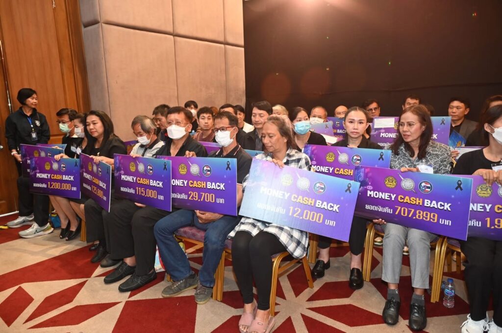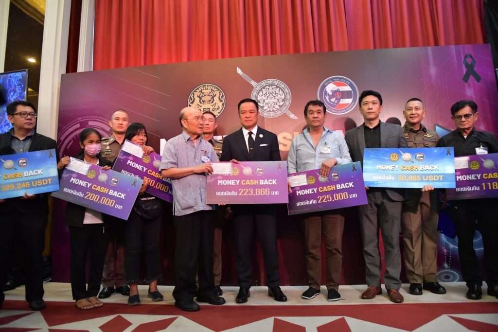 จากนั้น นายกรัฐมนตรีและรมว.มหาดไทย พร้อมด้วยปลัดกระทรวงมหาดไทย และผู้บัญชาการตำรวจแห่งชาติ ร่วมมอบเช็คเงินสดให้กับผู้เสียหายตาม “โครงการ Money Cash Back” ซึ่งเป็นเงินที่ผู้เสียหายถูกหลอกลวง รวม 33 ราย เป็นเงิน 15 ล้านบาท โดยได้รับความร่วมมืออย่างดีจากสถาบันการเงินและหน่วยงานที่เกี่ยวข้อง ซึ่งที่ผ่านมาสามารถติดตามเงินคืนให้กับผู้เสียหายรวม 312 ล้านบาท และเยี่ยมชมนิทรรศการผลการปฏิบัติภาพรวมสำนักงานตำรวจแห่งชาติและภาคีเครือข่าย อาทิ AIS True Money Line Corporation รวมถึงรับทราบแอปพลิเคชั่น Cyber Check ของสำนักงานตำรวจแห่งชาติซึ่งเป็นแพลตฟอร์มสแกนวงจรสแกมเมอร์ผ่านแพลตฟอร์มหลักในประเทศและต่างประเทศ โดยในวันนี้ ผศ.ดร.ณัฐพร กาญจนภูมิ คณบดีคณะเทคโนโลยีสารสนเทศและการสื่อสาร ได้มอบดอกไม้เพื่อเป็นการขอบคุณนายกรัฐมนตรีและรัฐมนตรีว่าการกระทรวงมหาดไทยที่ได้เดินหน้านโยบายปราบปรามสแกมเมอร์อย่างเข้มข้น ส่งผลให้ล่าสุด กองบัญชาการตำรวจภูธรภาค 7 ได้ช่วยเหลือนักศึกษาชั้นปีที่ 3 คณะเทคโนโลยีสารสนเทศและการสื่อสาร มหาวิทยาลัยศิลปากร ซึ่งถูกแก๊งคอลเซ็นเตอร์หลอกลวงให้โอนเงิน 830,000 บาท โดยสามารถอายัดเงินได้ทันและระงับไม่ให้น้องนักศึกษาโอนเงินเพิ่มด้วย และคุณฮาร์ท สุทธิพงศ์ ทัดพิทักษ์กุล เป็นตัวแทนประชาชนที่เดือดร้อนจากแก๊งต้มตุ๋นกลวงมิจฉาชีพ ร้องเพลงขอบคุณรัฐบาลและสำนักงานตำรวจแห่งชาติที่ทำงานอย่างเข้มแข็งเชิงรุกจนกระทั่งได้ค่าเสียหายมาชดเชยให้กับประชาชนผู้ได้รับความเสียหาย ถือเป็นผลงานชิ้นสำคัญของรัฐบาลและสำนักงานตำรวจแห่งชาติ