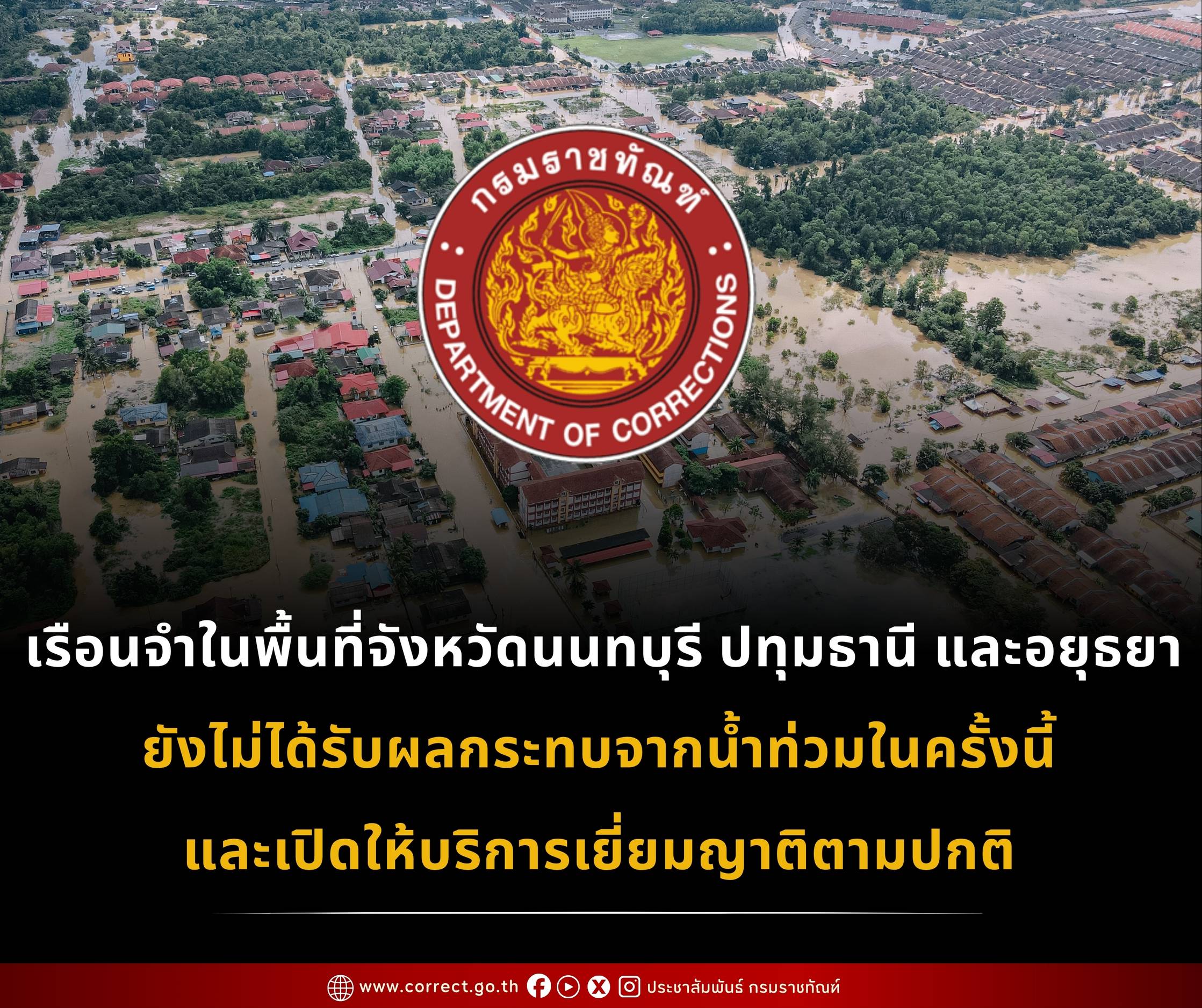 กรมราชทัณฑ์ ขอเรียนว่า ปัจจุบันกลุ่มเรือนจำที่ตั้งอยู่ในเขตพื้นที่จังหวัดนนทบุรี ปทุมธานี และพระนครศรีอยุธยา ทั้งหมดยังไม่ได้รับผลกระทบจากสถานการณ์น้ำท่วมในครั้งนี้แต่อย่างใด และยังคงเปิดให้บริการเยี่ยมญาติตามปกติ ซึ่งกรมราชทัณฑ์ได้ให้เรือนจำ/ทัณฑสถาน เตรียมความพร้อมในการรับมือเฝ้าระวังจากสถานการณ์ดังกล่าวอย่างต่อเนื่อง ทั้งในด้านการบริหารจัดการ เตรียมสถานที่ที่เหมาะสมหากต้องมีการขนย้ายอุปกรณ์ หรือเอกสารสำคัญของผู้ต้องขัง รวมถึงการเฝ้าระวังตรวจสอบระบบไฟฟ้าสำรอง ตลอดจนการเพิ่มความระมัดระวังในการควบคุมดูแลผู้ต้องขังทั้งกลางวันและกลางคืน