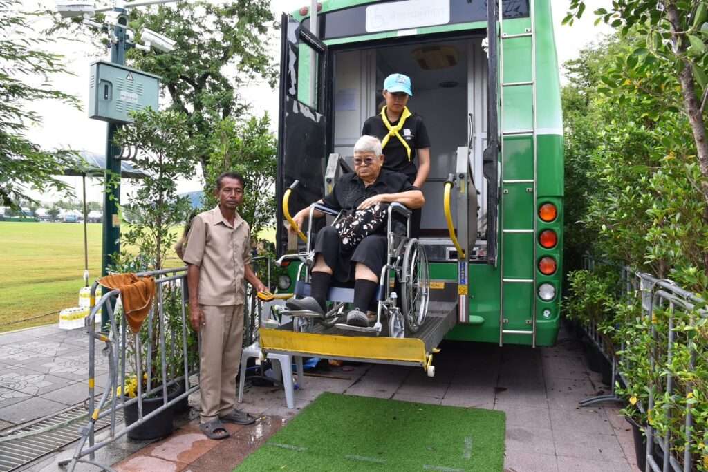 นอกจากนี้ ยังได้จัดเตรียมรถวีลแชร์และรถกอล์ฟสำหรับให้บริการผู้สูงอายุ ผู้พิการ และผู้ที่ต้องการความช่วยเหลือพิเศษ โดยมีเจ้าหน้าที่และอาสาสมัครคอยดูแลอย่างใกล้ชิด เพื่อให้ทุกคนสามารถเข้าร่วมกราบถวายบังคมได้อย่างทั่วถึงและปลอดภัย