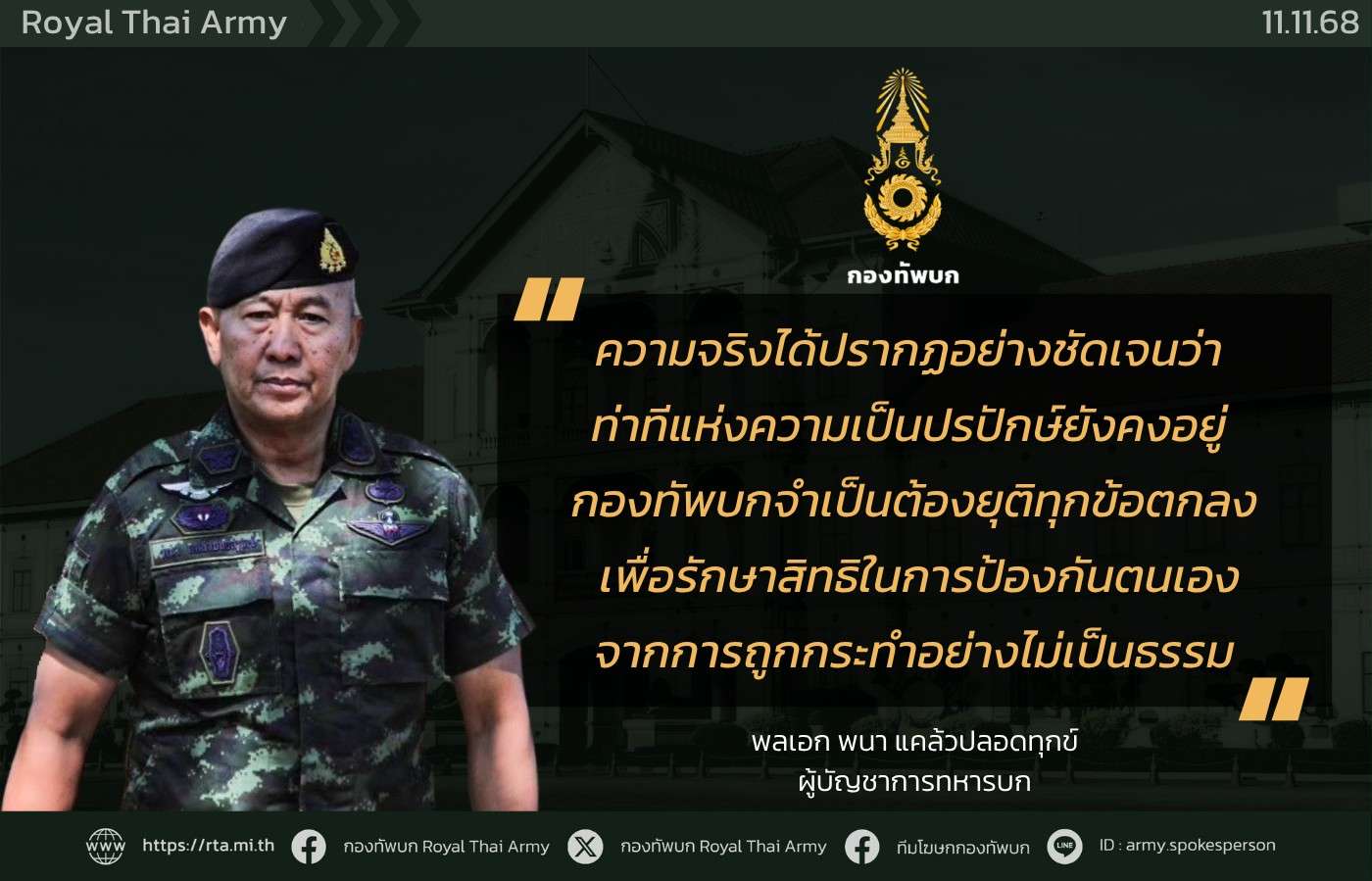 กองทัพบก, 11 พ.ย. – จากสถานการณ์ชายแดนไทย–กัมพูชาที่มีความตึงเครียดเพิ่มขึ้น ภายหลังเหตุการณ์ที่มีกำลังพล 2 นายได้รับบาดเจ็บจากการเหยียบทุ่นระเบิดขณะลาดตระเวนในพื้นที่ห้วยตามาเรีย อ.กันทรลักษณ์ จ.ศรีสะเกษ เมื่อสายของวันที่ 10 ที่ผ่านมา โดยมีทหารนายหนึ่งต้องสูญเสียขาขวา ซึ่งถือเป็นรายที่ 7 พลเอก พนา แคล้วปลอดทุกข์ ผู้บัญชาการทหารบก ได้แสดงจุดยืนของกองทัพบกว่า “ความจริงได้ปรากฏอย่างชัดเจนแล้วว่า ท่าทีแห่งความเป็นปรปักษ์ยังคงอยู่ กองทัพบกจำเป็นต้องยุติทุกข้อตกลง เพื่อรักษาสิทธิในการป้องกันตนเองจากการถูกกระทำอย่างไม่เป็นธรรม”