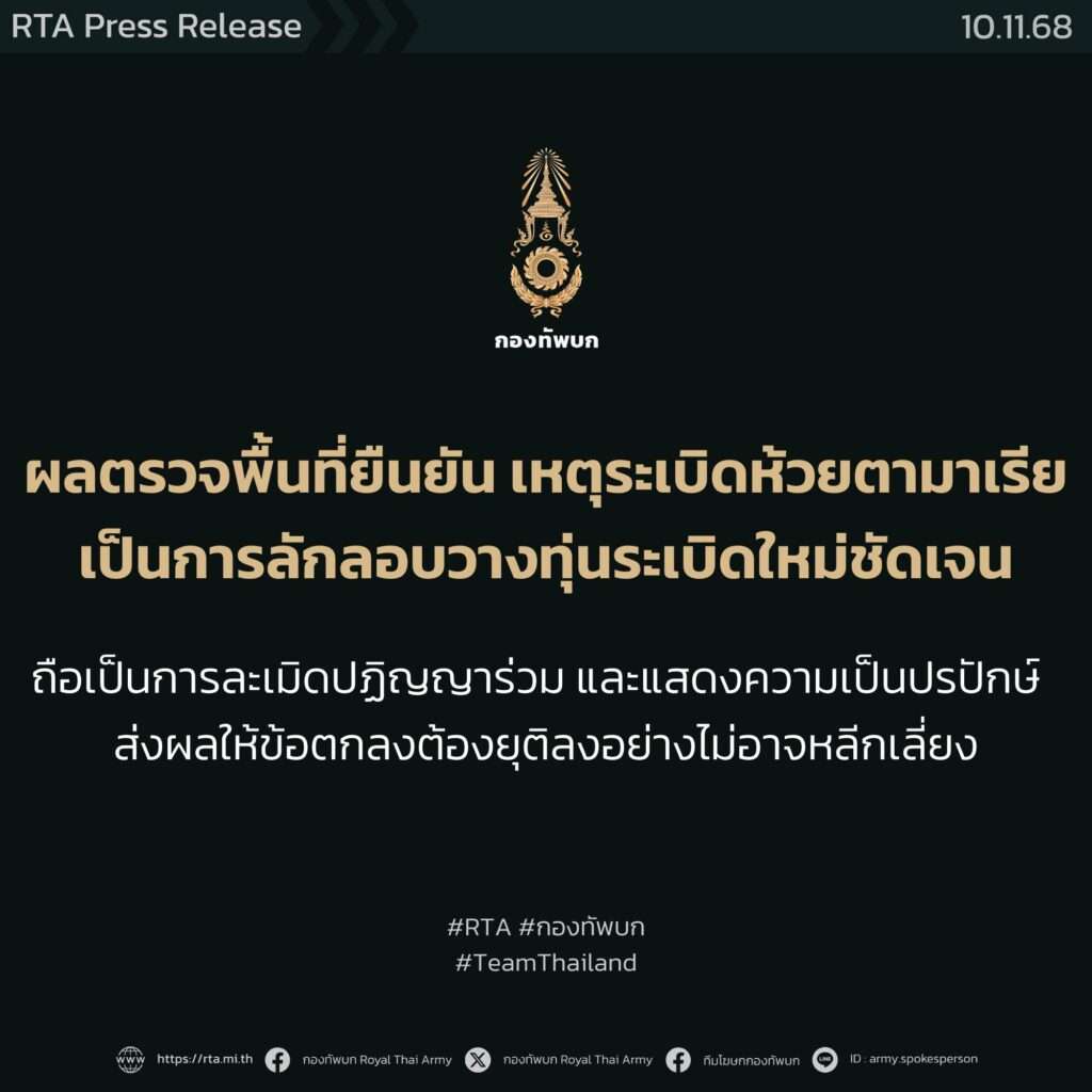 “จากหลักฐานที่ปรากฏ จึงสรุปได้ว่า ทุ่นระเบิดดังกล่าวเป็นการลักลอบรื้อถอนลวดหนามและเข้ามาวางทุ่นระเบิดใหม่ในเขตไทย โดยมีเป้าหมายคือกำลังพลที่ลาดตระเวนเส้นทางอยู่เป็นประจำ การกระทำดังกล่าวแสดงถึงความไม่จริงใจในการลดความขัดแย้งของฝ่ายกัมพูชา และสะท้อนถึงความเป็นปรปักษ์ระหว่างกัน ซึ่งขัดต่อปฏิญญาร่วมที่ได้ลงนามไว้อย่างชัดเจน ซึ่งย่อมส่งผลกระทบต่อท่าทีของฝ่ายไทยและข้อตกลงต่าง ๆ อย่างไม่อาจหลีกเลี่ยง” โฆษก ทบ. กล่าว