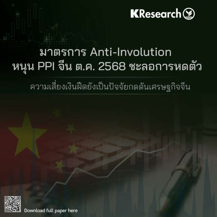 กรุงเทพฯ วันที่ 11 พ.ย. ศูนย์วิจัยกสิกรไทย ประเมินสถานการณ์ เงินเฟ้อผู้ผลิตจีน (PPI) ในเดือน ต.ค.68 ว่าชะลอการหดตัวติดต่อกันเป็นเดือนที่ 4 อยู่ที่ -2.1%YoY จาก -2.3%YoY ในเดือน ก.ย.68 แม้เงินเฟ้อผู้ผลิตจะชะลอการหดตัวในบางอุตสาหกรรม แต่การจัดการปัญหาสงครามราคา และกำลังการผลิตส่วนเกิน หรือ Anti-Involution ยังต้องใช้มาตรการที่ชัดเจน และต้องใช้เวลา