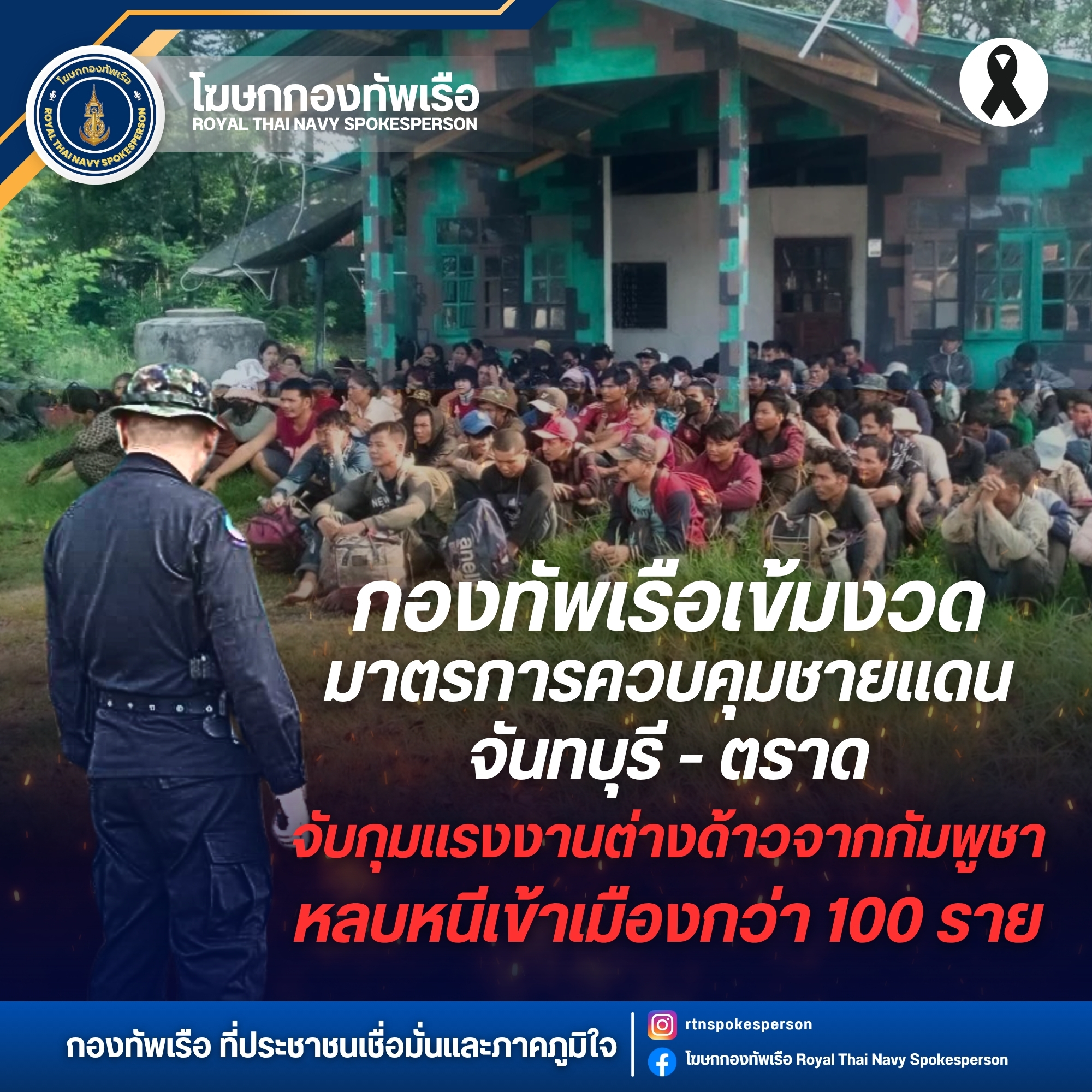 พลเรือตรี ปารัช รัตนไชยพันธ์ โฆษกกองทัพเรือ เปิดเผยว่า วันนี้ (12 พฤศจิกายน 2568) กองบัญชาการป้องกันชายแดนจันทบุรีและตราด (กปช.จต.) โดย หน่วยเฉพาะกิจนาวิกโยธินจันทบุรี (ชค.ทพ.นย.2) ภายใต้การควบคุมของ นาวาเอก วีระเชษฐ์ ขยันทำ ได้บูรณาการร่วมกับ สถานีตำรวจภูธรสะตอน ตำรวจตรวจคนเข้าเมือง และ ตำรวจสันติบาล จังหวัดจันทบุรี ได้ดำเนินการจับกุมผู้นำพาแรงงานต่างด้าวและแรงงานต่างด้าวสัญชาติกัมพูชาจำนวน 108 คน บริเวณบ้านสวนส้ม ตำบลสะตอน อำเภอสอยดาว จังหวัดจันทบุรี