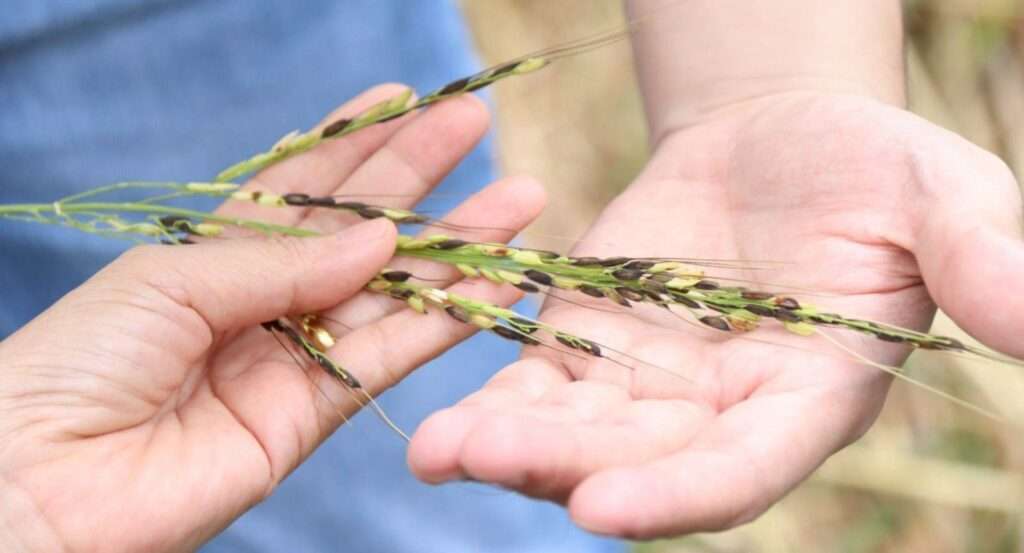 8. ลูบรวงข้าววัชพืชด้วยสารเคมีเฉพาะจุด โดยใช้ กลูโฟซิเนต-แอมโมเนียม อัตรา 100 – 200 มล./น้ำ 1 ลิตร ลูบช่วงข้าววัชพืชเริ่มออกรวง และตากเกสรไม่เกิน 3 วัน