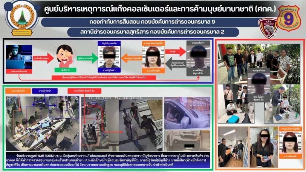 ต่อมาศูนย์บริหารเหตุการณ์แก๊งคอลเซ็นเตอร์และค้ามนุษย์นานาชาติ (ศกค.) โดย พล.ต.อ.ธนา ชูวงศ์ รอง.ผบ.ตร./ผอ.ศปอส.ตร./ผบ.ศกค. ได้สั่งการให้ พล.ต.ท.สยาม บุญสม ผบช.น./ผอ.ศปอส.บช.น. พล.ต.ต.วสันต์ เตชะอัครเกษม รอง ผบช.น./รอง ผอ.ศปอส.บช.น. พล.ต.ต.โชติวัฒน์ เหลืองวิลัย ผบก.สส.บช.น./เลขาฯ ศปอส.บช.น.และ พล.ต.ต.สามารถ พรหมชาติ ผบก.น.9/ผอ.ศปอส.บก.น.9 พล.ต.ต.เกียรติกุล สนธิเณร ผบก.น.2/ผอ.ศปอส.บก.น.2 มอบหมายให้ พ.ต.อ.ธีระชัย ฯ รอง ผบก.น.9 ได้สั่งการให้ฝ่ายสืบสวน บก.น. 9 ทำการสืบสวน โดยผู้เสียหายมีการโอนเงินจากบัญชีธนาคารกรุงเทพไปยังบัญชีธนาคารหลายบัญชี หนึ่งในนั้นคือบัญชีธนาคารไทยพาณิชย์ โดยมีการเบิกเงินสดออกจากบัญชี เมื่อวันที่ 12 ส.ค.68 จากการตรวจสอบเป็นบัญชีชื่อคนไทย