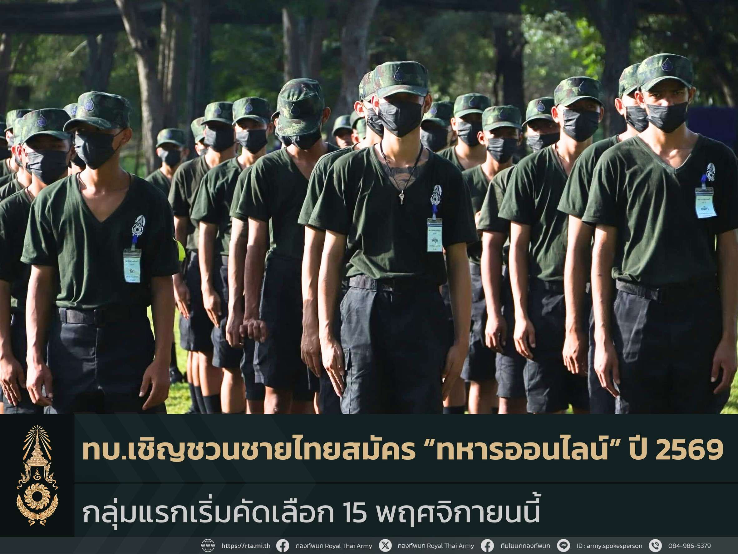 ทั้งนี้ ผู้ที่มีข้อสงสัยหรือต้องการข้อมูลเพิ่มเติม สามารถติดต่อสอบถามได้ที่ หน่วยทหารหรือหน่วยสัสดีใกล้บ้าน หรือ กองการสัสดี หน่วยบัญชาการรักษาดินแดน โทร. 0 2223 3259