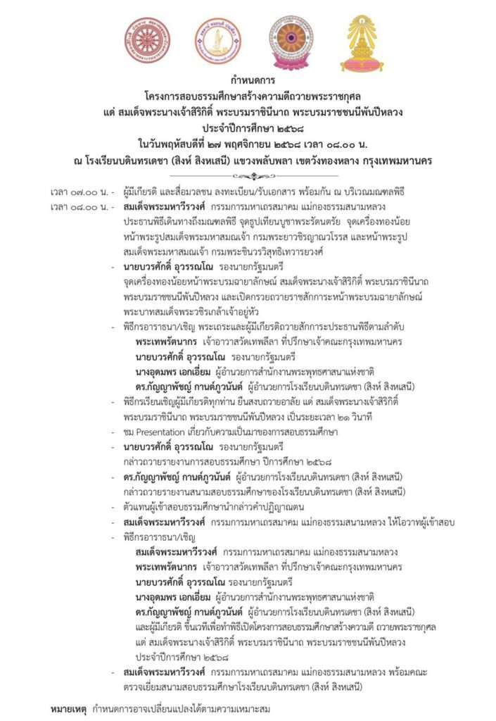 สำหรับกำหนดการพิธีเปิดโครงการสอบธรรมศึกษาสร้างความดีถวายเป็นพระราชกุศล จะมีขึ้นในวันที่ 27 พฤศจิกายน เวลา 08.00 น. ณ โรงเรียนบดินทรเดชา (สิงหเสนี) กรุงเทพมหานครโดยมีสมเด็จพระมหาวีรวงศ์กรรมการมหาเถรสมาคม แม่กองธรรมสนามหลวง เป็นประธานพิธี มีนายบวรศักดิ์ อุวรรณโณ รองนายกรัฐมนตรี เป็นผู้กล่าวถวายรายงานการสอบธรรมศึกษาปี 2568, ดร.กัญญาพัชญ์ กานต์ภูวนันท์ ผู้อำนวยการโรงเรียนบดินทรเดชา กล่าวถวายรายงานสนามสอบธรรมศึกษา รร.บดินทรเดชา