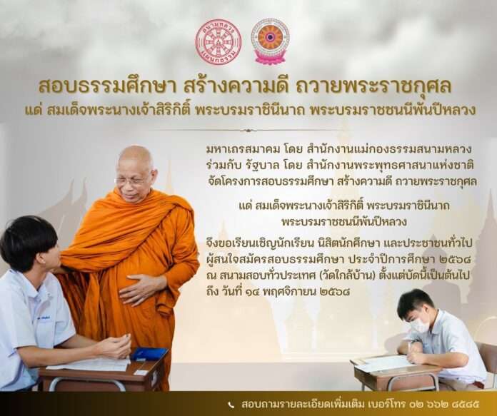 กรุงเทพฯ, วันที่ 13 พ.ย. – มหาเถรสมาคม โดยสำนักงานแม่กองธรรมสนามหลวง ร่วมกับรัฐบาลโดยสำนักงานพระพุทธศาสนาแห่งชาติ จัดโครงการสอบธรรมศึกษา สร้างความดีถวายพระราชกุศลแด่สมเด็จพระนางเจ้าสิริกิติ์พระบรมราชินีนาถพระบรมราชชนนีพันปีหลวงขอเรียนเชิญนักเรียนนิสิตนักศึกษาและประชาชนทั่วไปผู้สนใจสมัครสอบธรรมศึกษาประจำปีการศึกษา 2568 ณสนามสอบทั่วประเทศ (วัดใกล้บ้าน) ตั้งแต่บัดนี้เป็นต้นไป