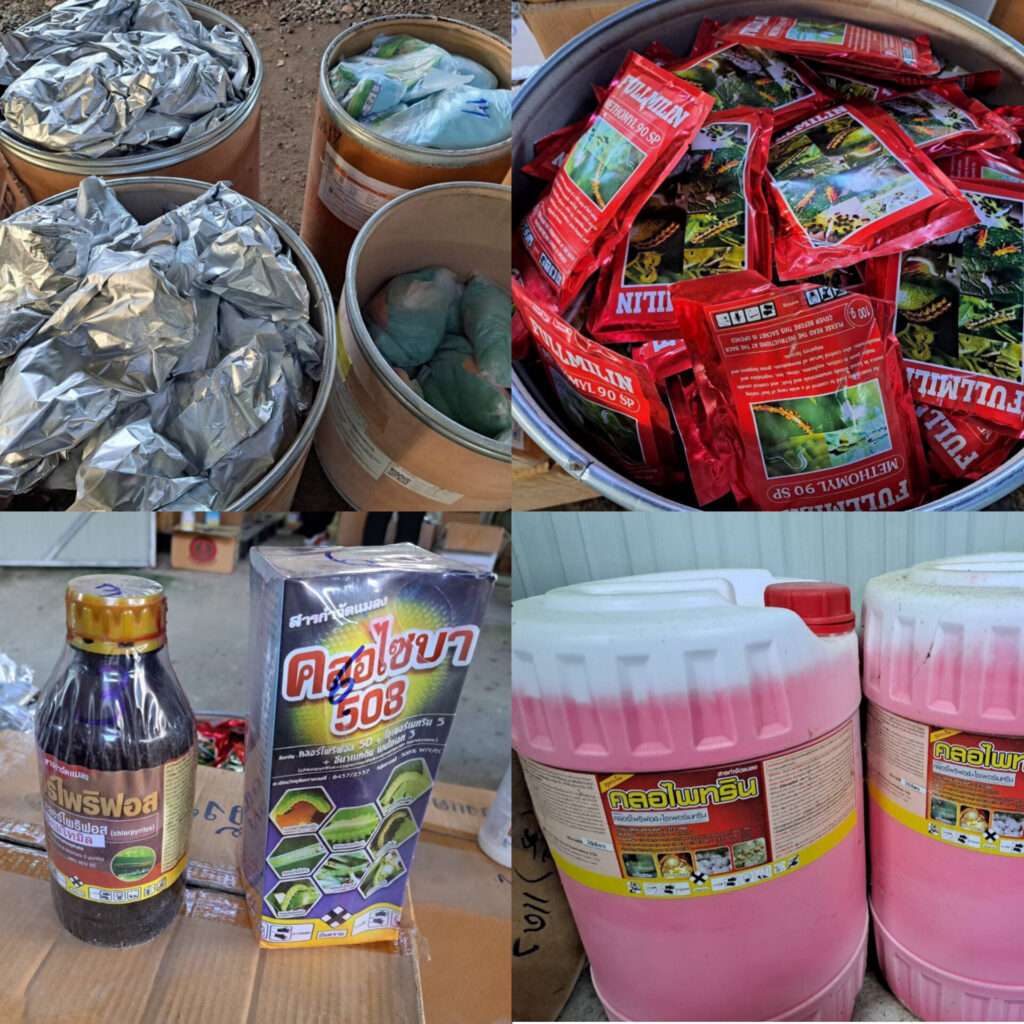 เจ้าหน้าที่พบสารเคมีการเกษตรปลอมจำนวน 24 รายการ มูลค่ารวมกว่า 1 ล้านบาท แบ่งเป็น 3 กลุ่มหลัก ได้แก่กลุ่มสารกำจัดวัชพืช, ไกลโฟเซต ไอโซโพรพิลแอมโมเนียม, กรูโฟซิเนต–แอมโมเนียม, กลุ่มสารกำจัดแมลง, ไซเพอร์เมทริน, อีมาเมคติน เบนโซเอท, แลมป์ 20 EC, โพรฟิโนฟอส และ ไดเมโทเอต