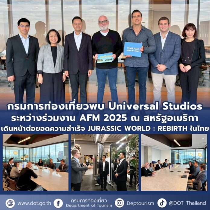 กรมการท่องเที่ยวเข้าพบผู้บริหาร Universal Studios สหรัฐอเมริกา ระหว่างเข้าร่วมงาน AFM2025 พร้อมขอบคุณที่เลือกประเทศไทยเป็นสถานที่ถ่ายทำ “Jurassic World: Rebirth” และเชิญชวนกลับมาถ่ายทำในประเทศไทยอีก