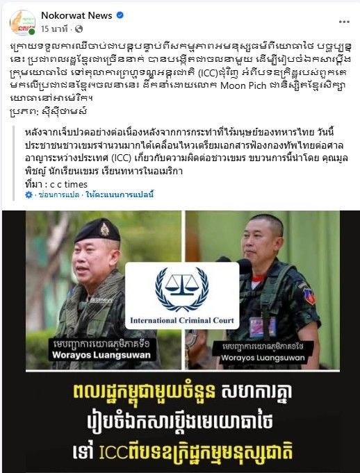 สื่อ Nokorwat News เผยแพร่ข้อมูลและนำภาพแม่ทัพภาคที่ 1 โพสต์ข้อความเตรียมรวบรวมข้อมูลเอกสารฟ้องร้องกองทัพไทย ต่อศาลอาญาระหว่างประเทศ (ICC) คาดผลจากมาตรการปิดด่านเข้ม ทำกัมพูชาไม่พอใจ เชื่อมโยงสถานการณ์ให้เป็นผู้ถูกกระทำ โดยข้อเท็จจริง ปรากฏแม่ทัพไก่ ลงพื้นที่ตรวจมาตรการเพื่อความเรียบร้อยเท่านั้น