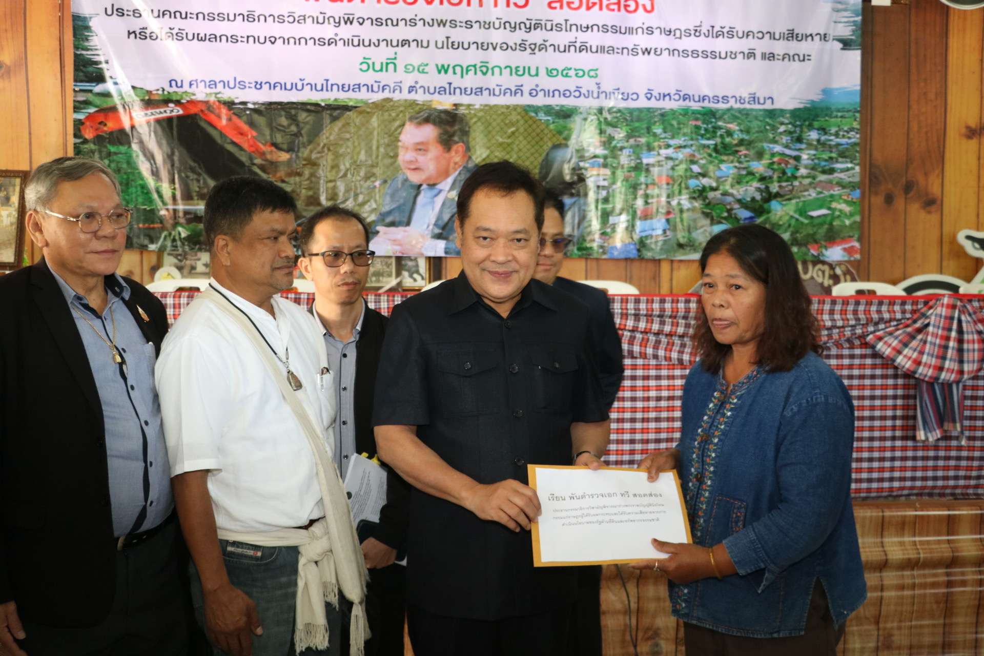 นครราชสีมา, 15 พฤศจิกายน – พันตำรวจเอก ทวี สอดส่อง สส.บัญชีรายชื่อ และหัวหน้าพรรคประชาชาติ ในฐานะประธานคณะกรรมาธิการวิสามัญพิจารณาร่างพระราชบัญญัตินิรโทษกรรมแก่ราษฎร ซึ่งได้รับความเสียหายหรือได้รับผลกระทบจากการดำเนินการตามนโยบายของรัฐด้านที่ดินและทรัพยากรธรรมชาติ (กมธ.นริโทษกรรมที่ดิน) พร้อมคณะ ได้เดินทางมาเป็นประธานการประชุมเพื่อรับฟังความเห็นจากภาคประชาชน ที่ศาลาประชาคมบ้านไทยสามัคคี อำเภอวังน้ำเขียว จังหวัดนครราชสีมา โดยมีนายกีรติวัฒน์ ธีระวัฒนา ปลัดอำเภอ รักษาราชการแทนนายอำเภอวังน้ำเขียว กล่าวรายงาน มีประชาชนกว่า 300 คน เข้าร่วมแสดงความคิดเห็นพร้อมยื่นหนังสือให้กับ พ.ต.อ. ทวี เพื่อสะท้อนปัญหาที่ได้รับผลกระทบ