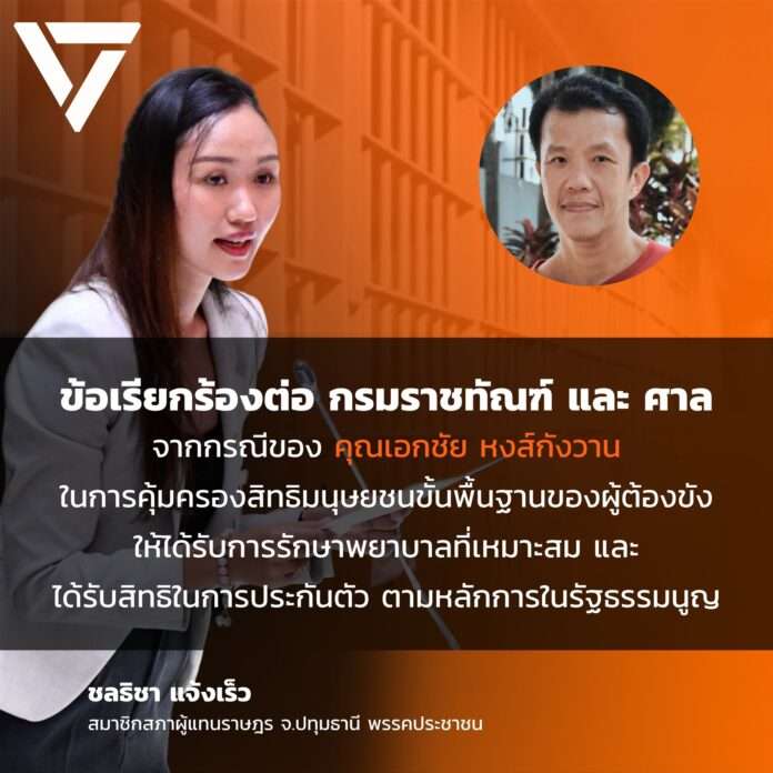 “ดิฉันขอยืนยันว่า สิทธิในการได้รับการรักษาพยาบาล คือสิทธิมนุษยชนขั้นพื้นฐาน ผู้ต้องขังทุกคนต้องได้รับสิทธินี้อย่างเสมอภาคและเท่าเทียมกันโดยไม่ล่าช้า ดิฉันจึงขอเรียกร้องไปยังกรมราชทัณฑ์ ให้พัฒนาระบบบริการทางการแพทย์ของเรือนจำทุกแห่งให้ได้มาตรฐาน ให้สามารถดูแลสุขภาพผู้ต้องขังได้อย่างมีประสิทธิภาพ และกรมราชทัณฑ์ ต้องรับผิดชอบต่อการทำเอกสารคำร้องขอรับการรักษาพยาบาลของคุณเอกชัยและทนายความสูญหาย โดยการพิจารณาคำร้องของคุณเอกชัยและทนายความอย่างเร่งด่วนที่สุด เพื่อป้องกันไม่ให้อาการของโรคเลวร้ายขึ้นจากการไม่ได้รับการรักษาอย่างต่อเนื่อง และกรมราชทัณฑ์ควรต้องพิจารณาจัดทำระบบการยื่นคำร้องที่จะไม่ให้เกิดข้อผิดพลาดเช่นนี้อีก” สส.ปทุมธานี พรรคประชาชน กล่าว