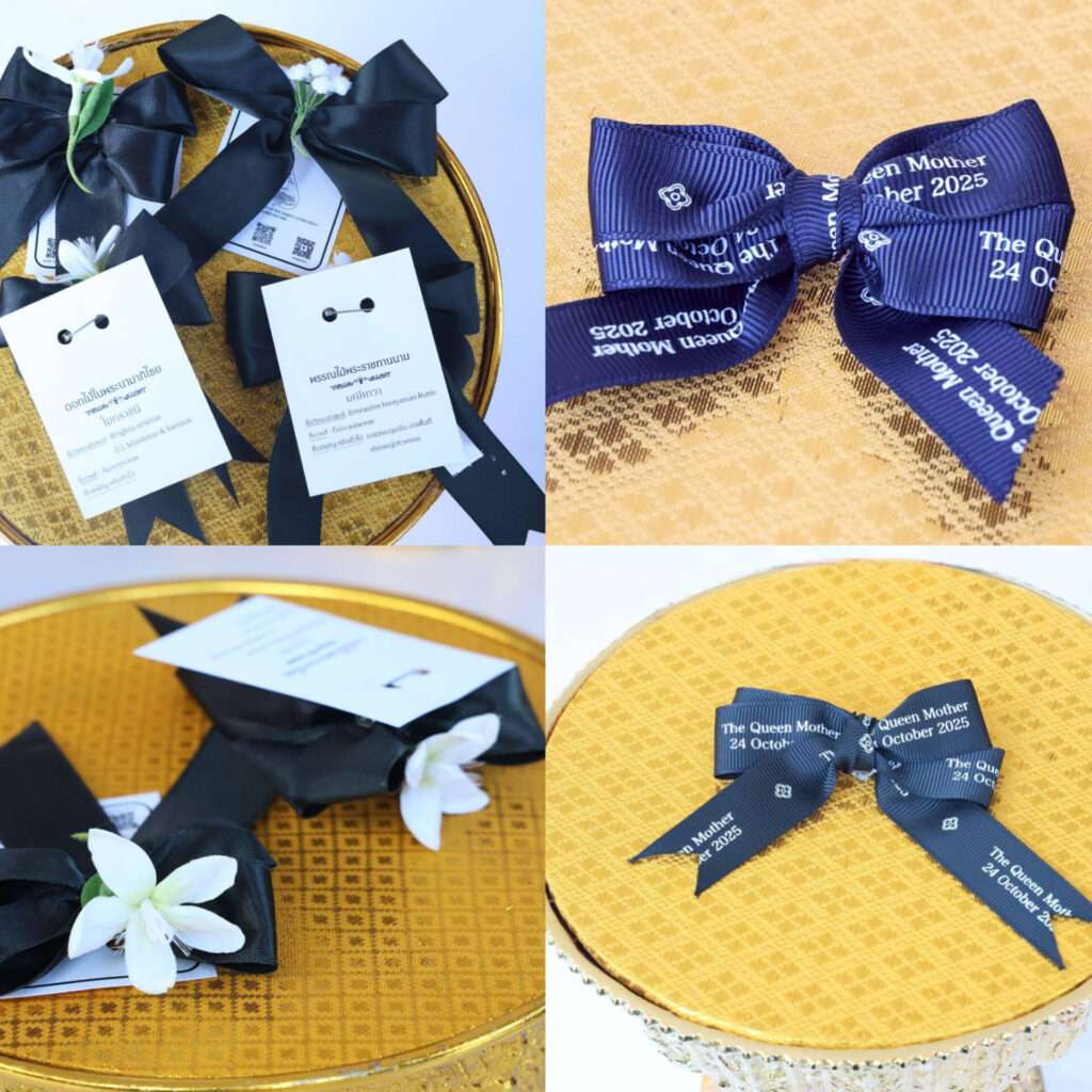 สำหรับเข็มกลัดริบบิ้นสีดำไว้อาลัย เป็นริบบิ้นที่ทรงโปรดให้มูลนิธิส่งเสริมศิลปาชีพ ในสมเด็จพระนางเจ้าสิริกิติ์ พระบรมราชินีนาถ พระบรมราชชนนีพันปีหลวงจัดทำขึ้น ตรงกลางประดับด้วยดอกไม้ประดิษฐ์ ได้แก่ “โมกราชินี” และ “มณีเทวา” ซึ่งเป็นดอกไม้ที่สมเด็จพระนางเจ้าสิริกิติ์ พระบรมราชินีนาถ พระบรมราชชนนีพันปีหลวง พระราชทานนาม และเข็มกลัดริบบิ้นสีดำ พิมพ์คำว่า “The Queen Mother 24 October 2025” ที่ทรงประดิษฐ์ด้วยพระองค์เอง เพื่อแสดงความอาลัย และน้อมรำลึกในพระมหากรุณาธิคุณของสมเด็จพระนางเจ้าสิริกิติ์ พระบรมราชินีนาถ พระบรมราชชนนีพันปีหลวง